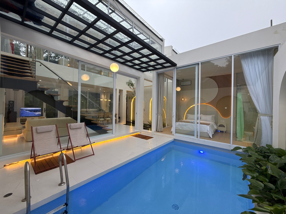 Una villa de lujo, muy🅾 instagrameable, repleta de instalaciones con una vista impresionante del valle que se puede disfrutar mientras se nada en una piscina infinita o se relaja en un jacuzzi ♨️(se aplican cargos por el jacuzzi, opcional) En una de nuestras habitaciones, puedes escuchar el relajante sonido del río. En otro, puedes sentarte en una silla colgante, a 5 metros del suelo, mientras lees tu libro favorito y bebes una taza de café. También puedes jugar al billar y al hockey de aire con tu familia.