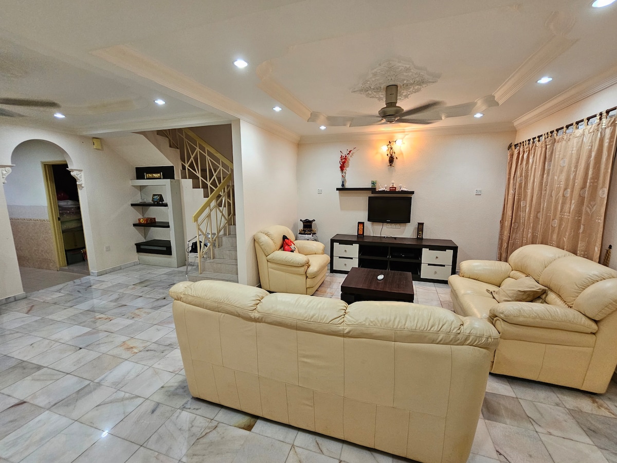 Amplia villa de 5000 pies cuadrados con 4 dormitorios, 3 baños y medio, cocina moderna, jardín privado y aparcamiento, ubicada en Bukit Mertajam, perfecta para familias y grupos. 5000 平方英尺宽敞别墅,4 房 3.5 卫,现代厨房 ,私家花园与停车位 — 家庭与团体的理想选择。 Nuestra villa fresca y cómoda se encuentra en una ubicación tranquila y silenciosa, a solo 2 minutos de la famosa iglesia histórica de Santa Ana.