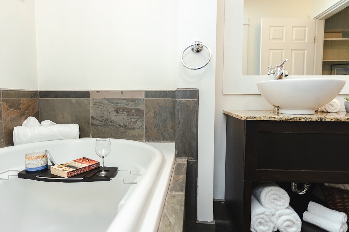 Casa privada patrimonial de 2 pisos con chimenea de piedra en la cima de Cates Hill y sobre Snug Cove entre jardines privados y bosques antiguos. Superficie entrecruzada por senderos que conducen al Bosque Nacional Valhalla y a la Reserva Ecológica. Duerme con el sonido de Davies Creek. Si no te importan las colinas empinadas, a 15 minutos a pie del ferry, el centro de la cala, tiendas y restaurantes. 3 dormitorios, 2 baños (1 con bañera de inmersión). Enorme terraza para vivir en el interior y el exterior. NO SE ADMITEN MASCOTAS. El 100 % de los gastos de limpieza se destina a nuestros limpiadores.
