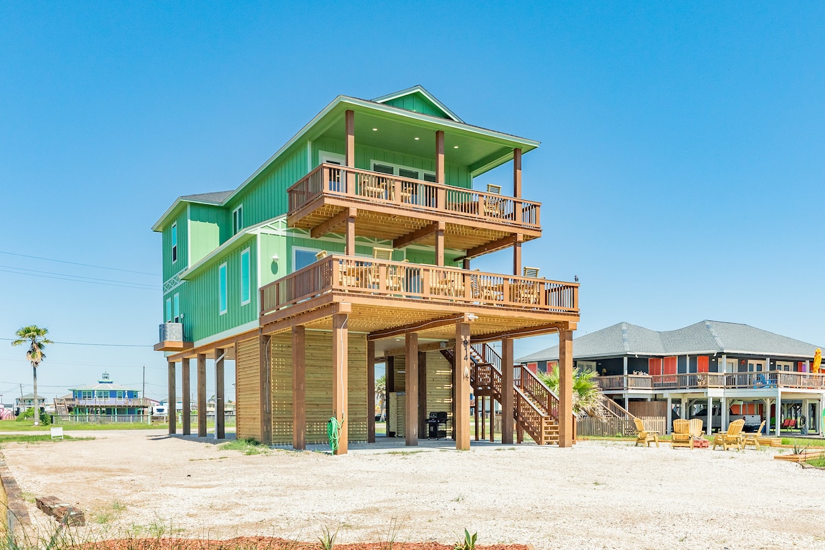 NEW Beachfront Construction! Truly a Unicorn:🦄 LOCATION, LUXURY, and So Nice to Have NEW! Located steps away from the best restaurants and beach in Surfside! Enjoy hammocks and games under the house. Climb the steps to an awesome shaded deck with views from San Luis Pass all the way to the Jetty! More than 180 degree unobstructed views. Bedrooms open to SunDeck and stargazing with fire 🔥 pit YouTube Beachfront Luxe for video $125 cleaning fee and only $75 total for up to 2 pets for whole stay!