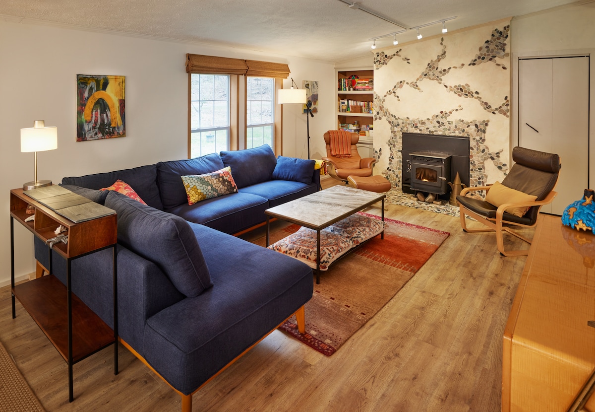 Moderno bungalow de estilo escandinavo frente al río en 8 acres. Siéntate en tu terraza con luces parpadeantes para tomar café/cenar lleno de sonidos y vistas de un río caudaloso; ¡cruza el río hasta tu propio lugar de baño privado! Perfecto para un retiro en la naturaleza, senderismo, natación, pesca (abastecido cada abril), esquí, trabajar con vistas a la montaña o escribir esa novela que siempre has querido terminar. A 2 horas del puente George Washington. Cargador de vehículos eléctricos de nivel 2. El odio no tiene cabida aquí, todos son bienvenidos.