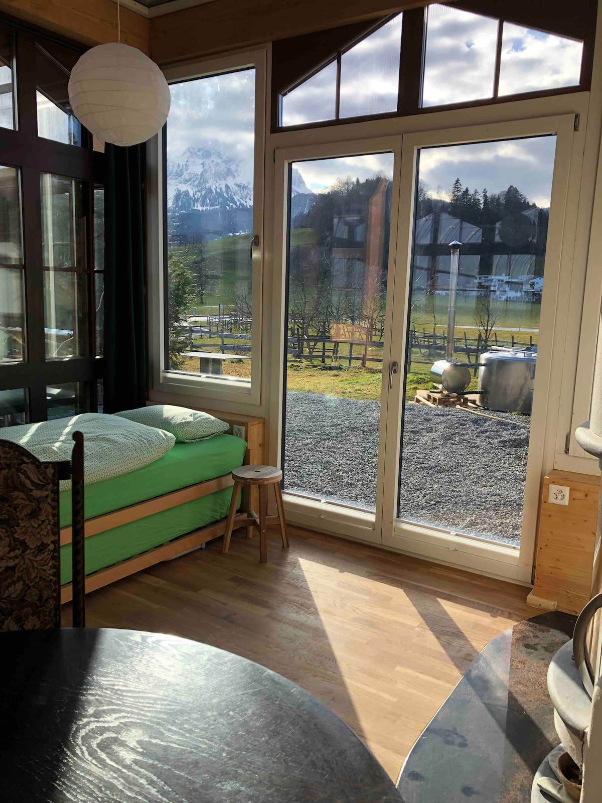 Private Unterkunft für zwei Personen in schönem Holzhäusschen mit toller Aussicht auf einem Bauernhof mitten im Grünen. Angebot für zwei Personen inklusive Frühstück. Es kann ein Candle light Dinner für Fr. 160.- dazu gebucht werden(bitte vor bestellen).Bezahlung vor Ort mit Twint oder Bar. Die Küche kann gegen eine Reinigungsgebühr von Fr. 25.- benutzt werden.