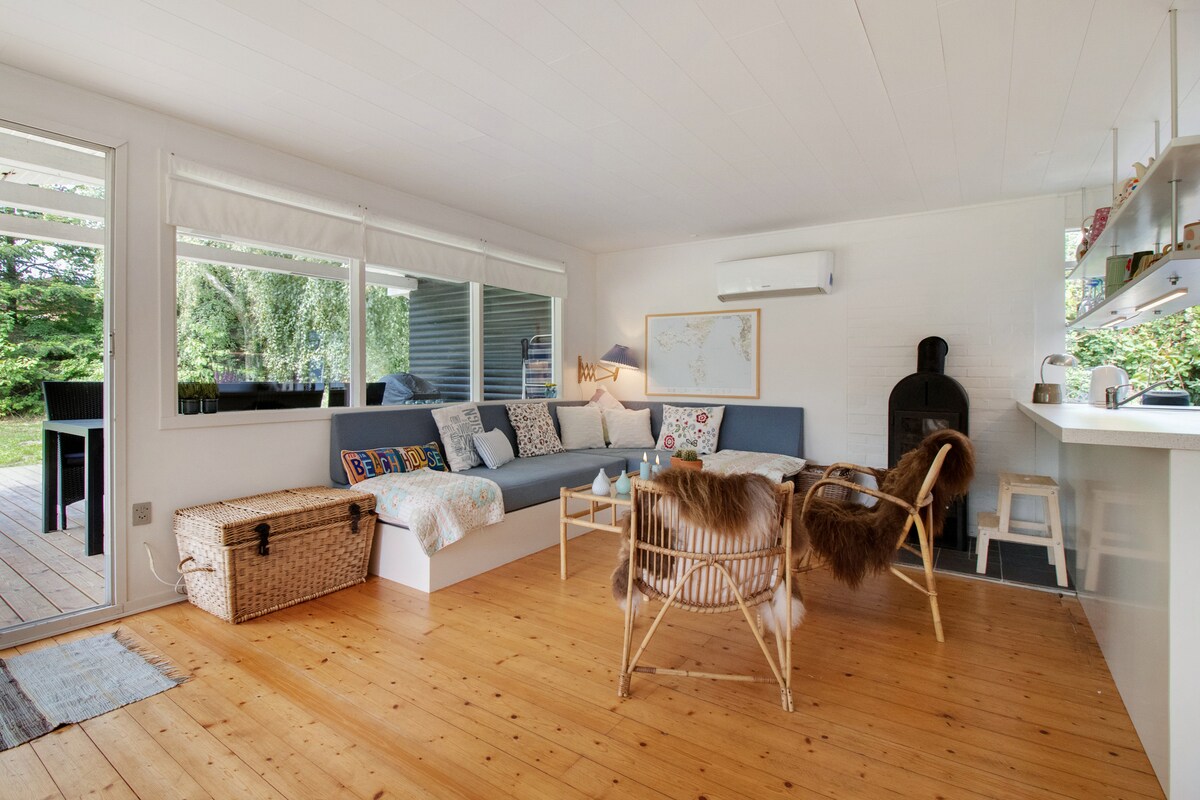 ¡ATENCIÓN! ¡La estancia incluye ropa de cama, toallas y limpieza final! NUEVO: ¡CARGADOR DE COCHE ELÉCTRICO en la casa! Hermosa casa de verano en la hermosa y tranquila costa noroeste de Mols. Se ha cuidado cada detalle interior y se ha llevado a cabo una decoración rara, elegante y atmosférica en la pequeña casa sencilla de 1978. El sol entra a raudales desde el gran jardín verde con terrazas orientadas al sur y al oeste, y hay solo 100 metros de paseando hasta la vista al mar, así como una hermosa ruta de senderismo en el borde del bosque en el borde de la pendiente hacia el mar.