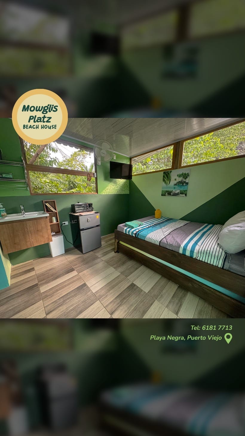 Una elegante cabina boho-tropical para 1–2 personas de nuestra casa de huéspedes en Cocles. Duerme cómodamente en una cama matrimonial con colchón ortopédico y sobrecolchón, disfruta de una cocineta y del ventanal con vista al jardín con muchas plantas, árboles frutales, iguanas, geckos y aves coloridas. En este oasis, aproveche una siesta en la hamaca o refréscarte en la mini piscina privada — perfecta para viajeros en busca de autenticidad, naturaleza y estilo.