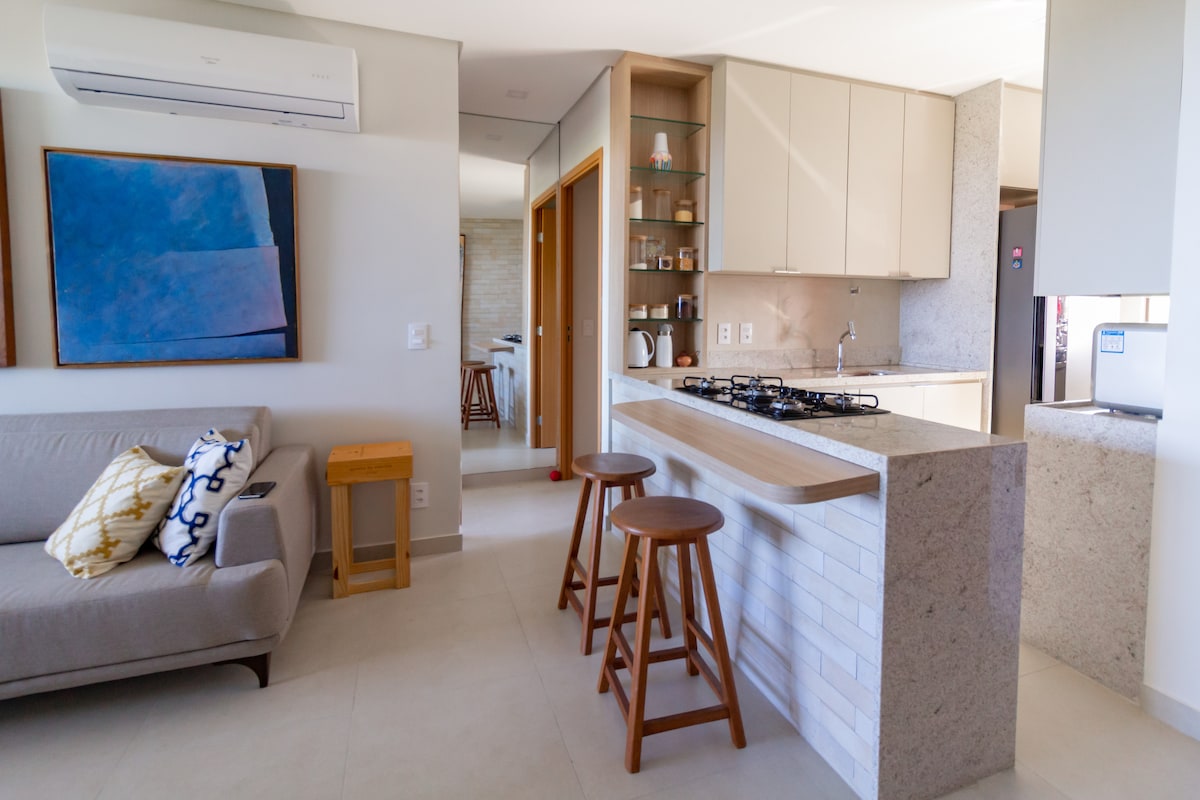 🏡 ¡Piso moderno y súper acogedor! Espacio completo con 2 dormitorios (1 cama tamaño queen, 1 cama doble) y sofá cama en el salón. Capacidad para 6 personas cómodamente. Cocina americana totalmente equipada, baño con lavabo de piedra, ropa de cama y toallas incluidas. El edificio es increíble: garaje cubierto, portero 24 horas, coworking, lavandería y azotea con gimnasio, sala de juegos, espacios gourmet y 4 piscinas con vistas. ☀️ ¡Perfecto para relajarse, disfrutar y sentirse como en casa! 💛