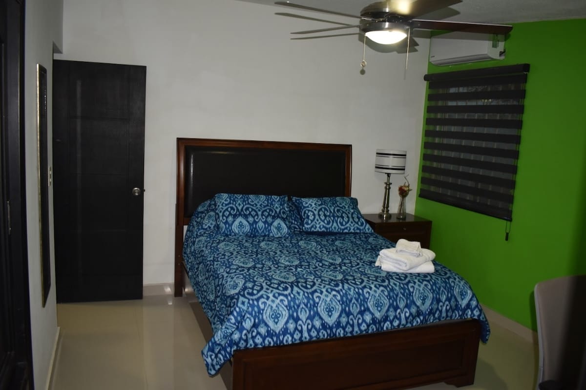 Departamento completo, cómodo e independiente. Tiene cama matrimonial, tv cable, WiFi y A/C, baño completo, cocineta con frigobar, parrilla doble con todo en la cocina, microondas y mesa/escritorio con 2 sillas para home office. La cocineta está completamente equipada