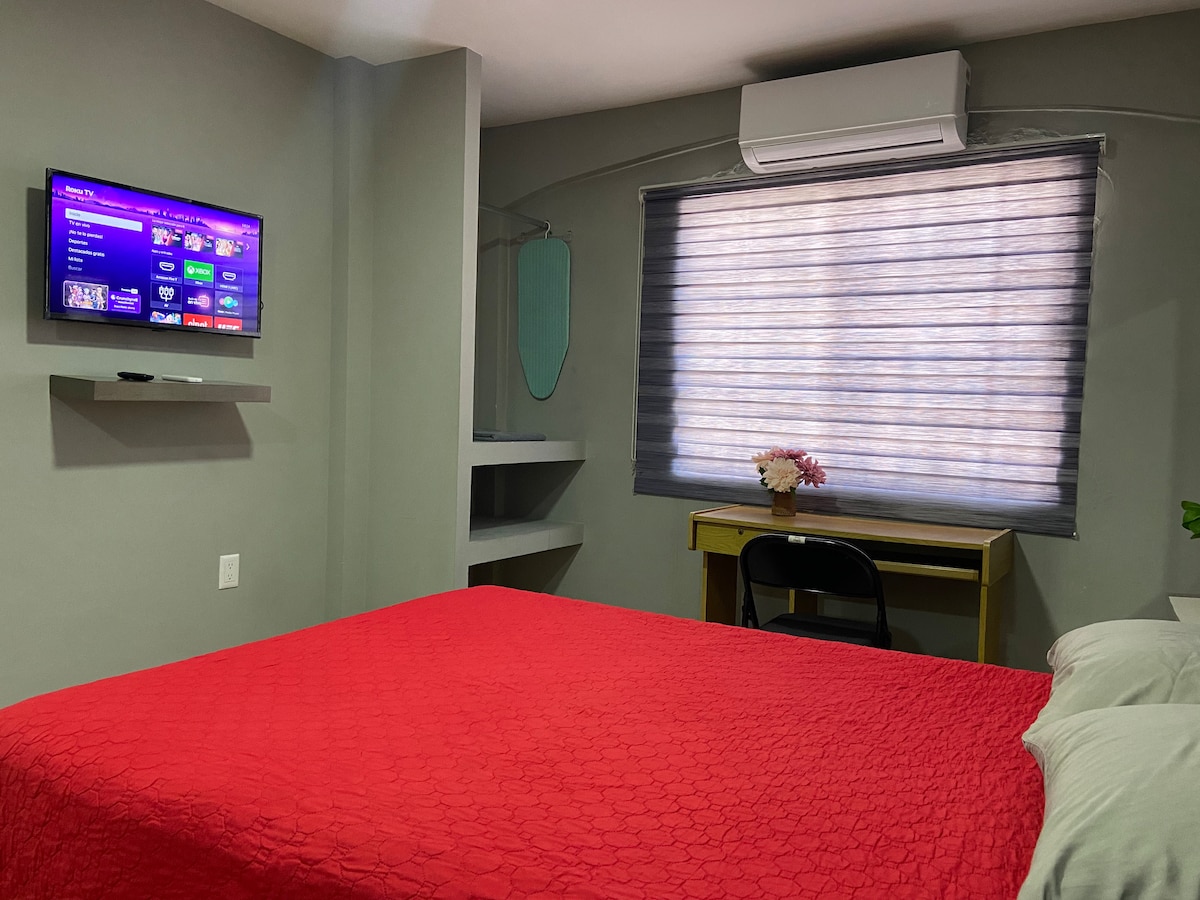 Departamento en planta baja, recién remodelado, acogedor, funcional. Dos recámaras con aire acondicionado y closets. Recámara principal con baño privado y escritorio c/silla de trabajo, excelente iluminación. Dos redes wifi a tu disposición. Segunda recámara con cama tipo canguro,una con rueditas abajo de la otra, ambas individuales. Segundo Baño completo. Desayunador y cocina equipada. Estacionamiento las 24 h. Total play TVCable HD 40" Excelente ubicación, al borde de céntrica avenida.