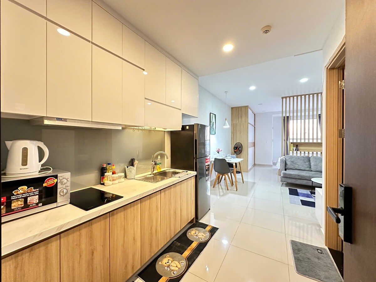 Este apartamento tipo estudio en el piso 22 es una opción cómoda para personas que viajan solas o en pareja y que visitan la ciudad de Ho Chi Minh. El espacio incluye una acogedora zona de dormitorio, una pequeña sala de estar y una bonita vista a la ciudad con vistas a la calle y vista parcial a la zona de la piscina. Una cocina totalmente equipada permite a los huéspedes prepararse comidas sencillas durante su estancia. Los huéspedes pueden relajarse con Netflix gratuito y wifi de alta velocidad, y disfrutar de acceso a la piscina y al gimnasio del edificio, con la comodidad de la llegada autónoma.