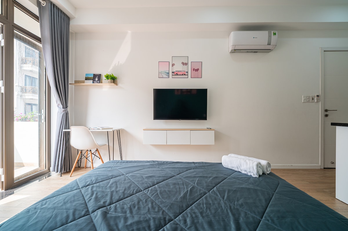 El apartamento tipo estudio con un gran balcón con vistas a la ciudad se encuentra en el edificio Sunrise Riverside en el sur de Saigón. Debajo del apartamento hay un Starbucks Coffee. Solo tardarás unos minutos en ir al centro comercial (Vivo City) y al Centro de Exposiciones (Secc). Además, hay muchas tiendas y restaurantes (7-Eleven, Family-mart, K-Mart, BBQ, Hotpot...) Hay un servicio de limpieza gratuito para reservas de más de 3 noches. Si lo necesitas, puedes avisar con 1 día de antelación.