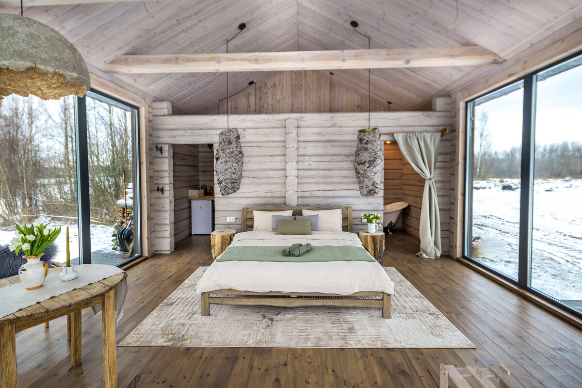 Disfruta de la tranquilidad en nuestra cabaña a la orilla del río Mituva. Relájate en la sauna, sumérgete en el jacuzzi y explora el agua con canoas y tablas de surf de remo. Ideal para los amantes de la naturaleza La cabaña cuenta con un interior amplio y bien equipado con un toque de elegancia rústica. La sala de estar abierta está adornada con una chimenea de leña, muchos asientos con dos enormes mesas y grandes ventanales que ofrecen impresionantes vistas del río y el bosque circundante. ¡DM para obtener más información antes de reservar!