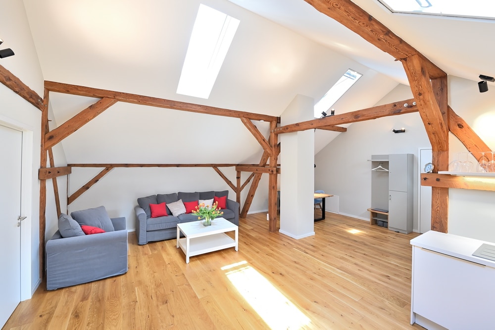 El Kranichhof "Atelier" es uno de los tres hermosos apartamentos de vacaciones en una antigua granja reformada y ampliada en el centro histórico de Wünsdorf. El "Atelier" se encuentra en el primer planta, tiene una gran terraza con vistas al suroeste sobre jardines, prados y huertos en la reserva natural y paisajística. La antigua estructura del tejado se ha incluido en el diseño abierto del apartamento. Parquet de roble, triple acristalamiento, estufa de leña, cocina abierta empotrada. ¡No se admiten mascotas!
