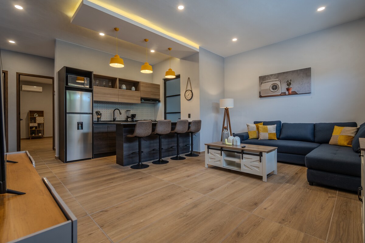 Departamento nuevo, completamente equipado con mobiliario y todos los accesorios nuevos, excelente ubicación. Cuenta con todas las comodidades y amenidades necesarias para hacer tu estadía más placentera con un Internet de alta velocidad, aire acondicionado en todas las areas y smart tv con Megacable incluido en todas las habitaciones, entre otras cosas.