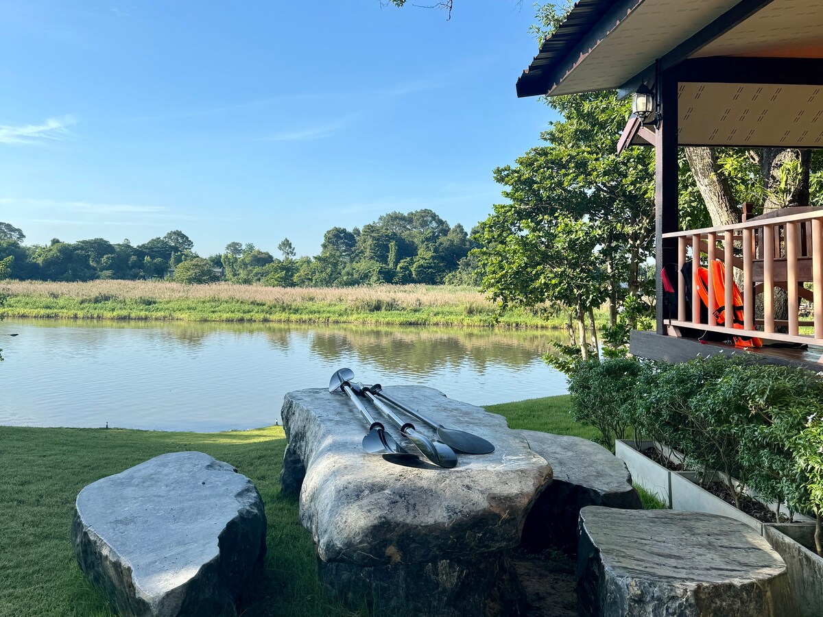 Descubre el tranquilo encanto del río Khwae Noi. Nuestro acogedor alojamiento es una de las 3 casas únicas en 8000 m² de terreno junto al río. ¡Esta casa ofrece las mejores y más impresionantes vistas al río! A solo 1,5 horas de Bangkok. Cerca de las principales atracciones y de cafeterías famosas. • Comodidad en casa: ¡recoge tu pedido o recíbelo a domicilio en la casa desde 7-Eleven! • Prueba las especialidades locales: barbacoa tailandesa. Disfruta del moo kra ta junto al río (se pueden pedir raciones adicionales). • Diversión y relax: actividades acuáticas, karaoke y juegos; ideal para ir en familia y con amigos.