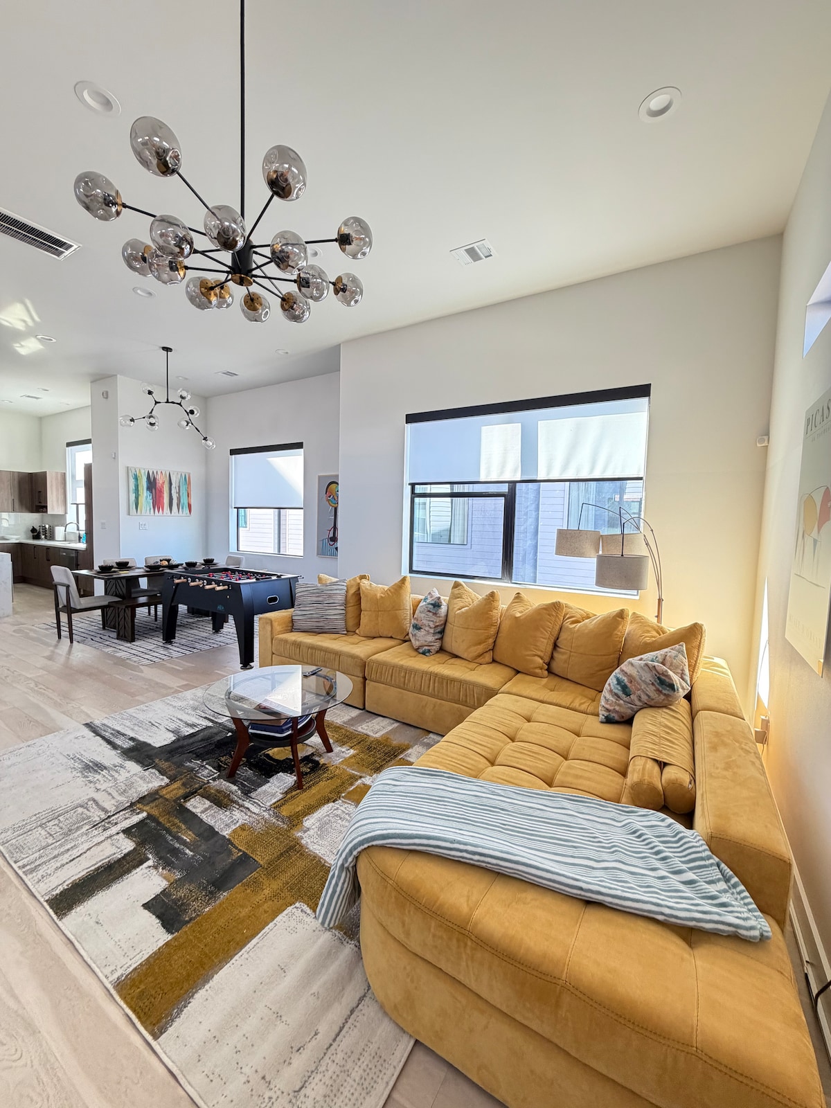 Disfruta del lujo en esta casa adosada de Houston con 3 dormitorios, cada uno con baño privado y TV. La casa inteligente tiene cerraduras automatizadas, luces, aspiradoras y termostatos. El segundo piso es un espacio de concepto abierto con cocina, comedor y sala de estar con TV Samsung de 85 pulgadas, mesa de billar, juegos de mesa y minibar. Hay una pequeña estación de trabajo en el dormitorio de abajo y un espacio de oficina con una configuración de trabajo completa. Disfruta de la zona de estar del patio trasero. Situado a menos de 5 millas del estadio NRG y del parque Minute Maid.