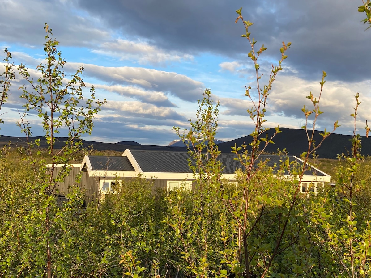 La casa es pequeña (60 metros cuadrados), a pocos kilómetros del lago Myvatn y de la cueva Grjotagja (carretera 860). Se encuentra en un hermoso paisaje de lava y abedules. La casa tiene dos dormitorios, ambos con camas dobles (1x1,53 m y 1x1,40 m), aseo con ducha, cocina, sala de estar con sofá cama (una persona). Un gran patio con barbacoa y muebles de exterior. Es el lugar perfecto para disfrutar de lo que ofrece la zona del lago Myvatn, así como de la parte noreste de Islandia.
