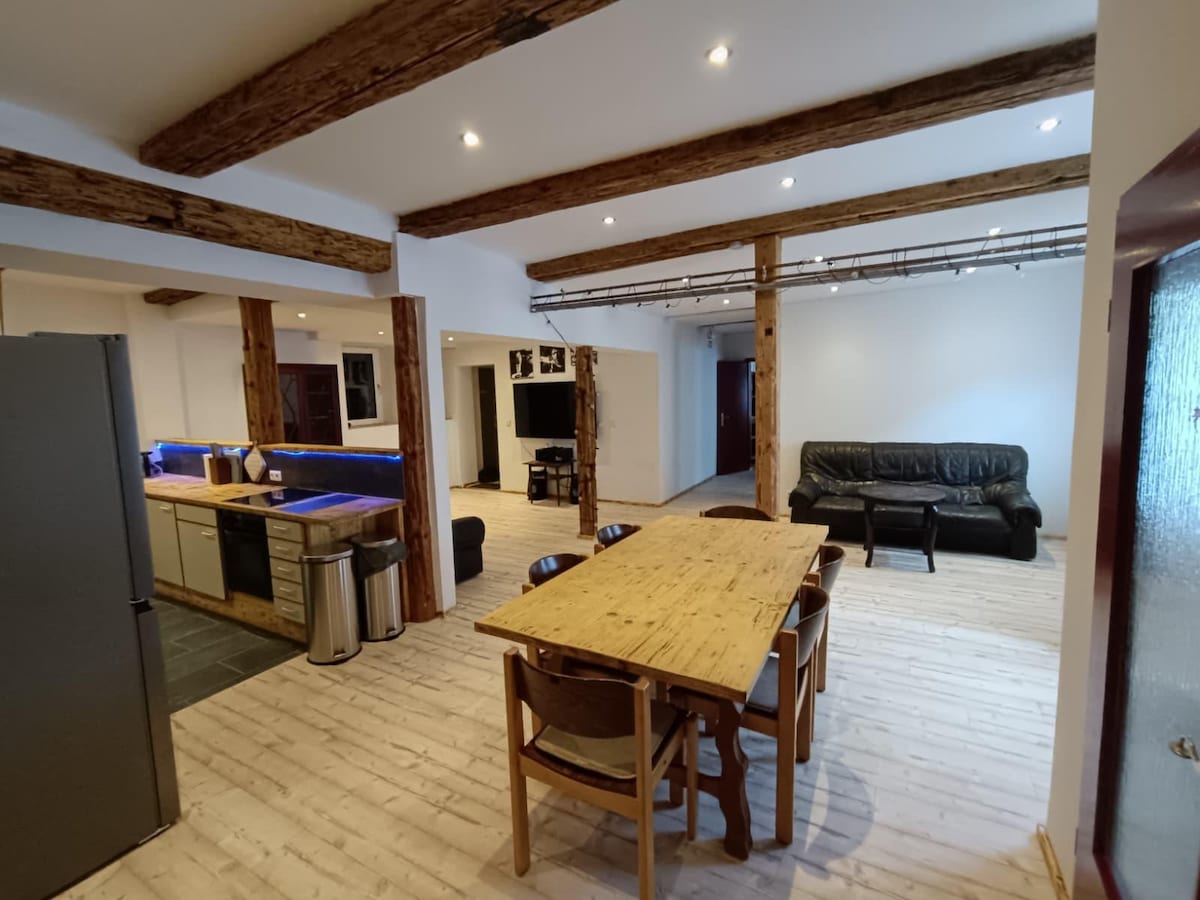 Vivir en una casa de Gründerzeit: ¡única, acogedora y un poco más bonita! El moderno loft se encuentra en una preciosa casa Gründerzeit en el centro de la ciudad de Hof. La zona peatonal y la estación de tren están a solo unos minutos a pie. El loft tiene una cocina americana, una cama tamaño queen, un baño privado con una bañera independiente y una ducha a nivel del suelo. Los focos del techo se pueden ajustar en color para crear un ambiente acogedor individualmente para bañarse.