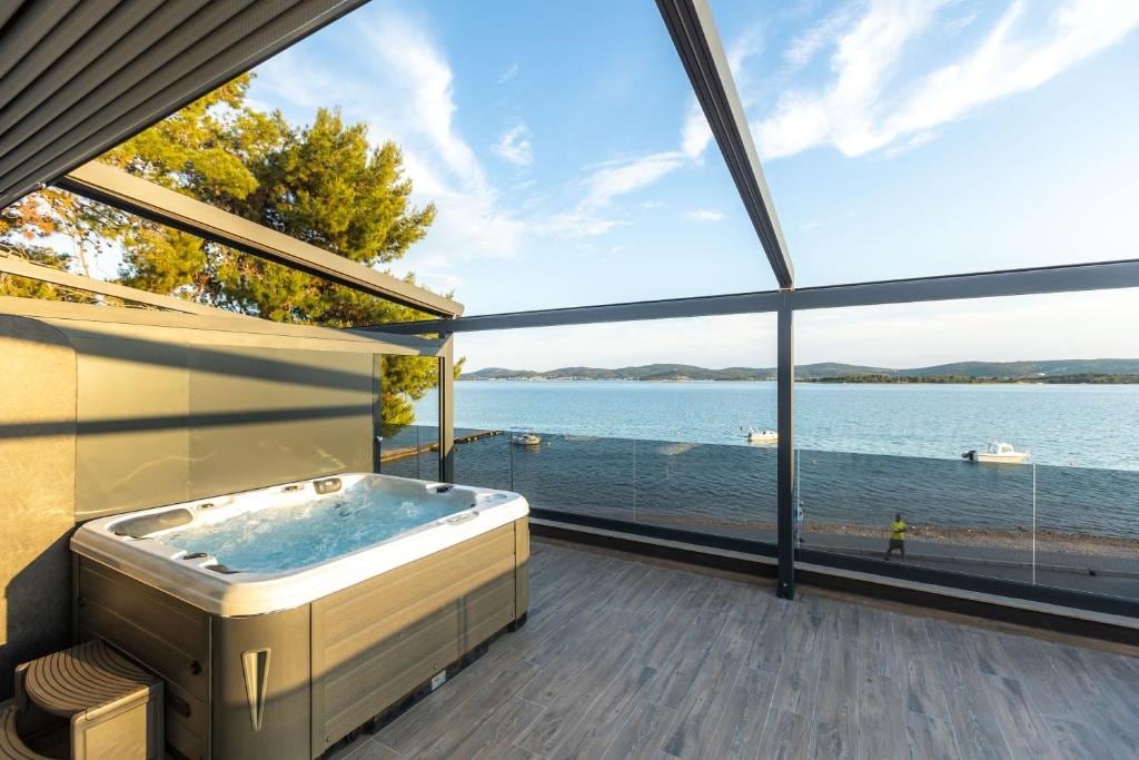 Ático de lujo frente al mar con terraza en la azotea y vistas panorámicas de 360 grados al mar, jacuzzi, bar y zona para tomar el sol, en el corazón de Murter. Distribuido en dos plantas, consta de una amplia suite ejecutiva con balcón y una terraza en la azotea (se necesita reserva adicional) arriba. Todo está a poca distancia a pie, como los mejores restaurantes locales. Marina a tu puerta y archipiélago de la bahía de Hramina en la palma de tu mano. Escapada perfecta para dos. A 7 minutos en coche de Garden Tisno. ¡Disfruta de la puesta de sol!