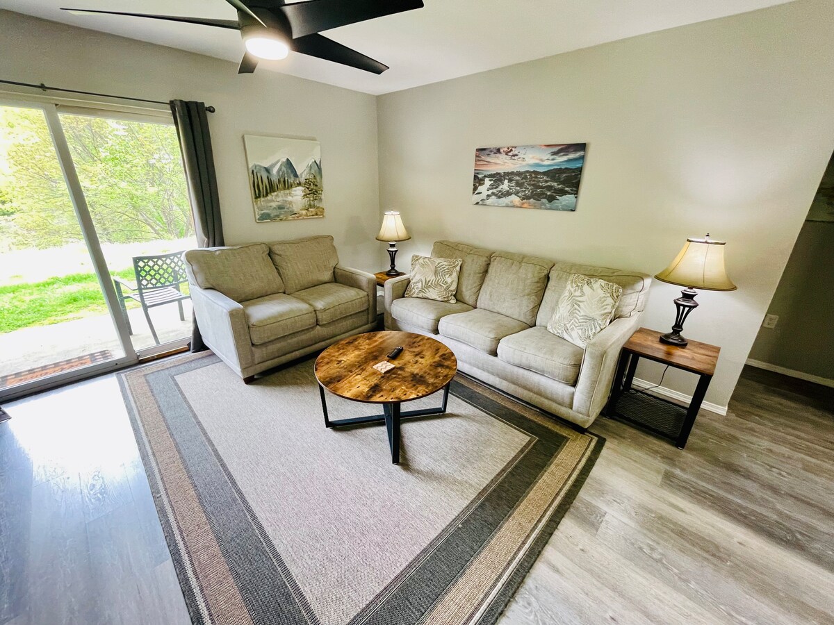 Este apartamento vacacional de Branson se encuentra en un complejo tranquilo en medio de más de 300 acres de montañas Ozark boscosas. ¡Disfrutarás de un apartamento que tiene una gran luz y hermosas vistas a las montañas Ozark! Nuestra cama tamaño queen tiene una cómoda cubierta de espuma de 4 pulgadas para brindarte la comodidad adicional de una gran noche de sueño fuera de casa. Hay un sofá muy cómodo (con un dormitorio tamaño queen) y un televisor grande en la sala de estar para que puedas relajarte después de un día divertido en el lago o en Branson.