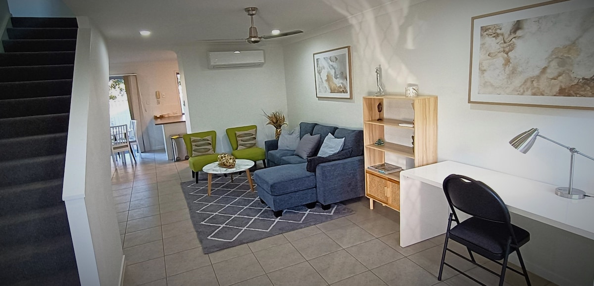 La casa forma parte de un pequeño complejo con los propietarios viviendo en el lugar. Casa: Queenslander renovado con garaje encubierto seguro. Cuenta con capacidad de hasta 5 huéspedes. Cocina: Totalmente equipada: nevera, microondas, horno, lavavajillas, cafetera. El comedor cuenta con una mesa grande y capacidad para 6 personas. Sala con 2 sofás y TV de 50 pulgadas Terraza con una gran mesa con capacidad para 6 personas. Jardín japonés con muebles. Ubicación: Estación de tren Booval a 300 m, autobús 100 m, tiendas, médico