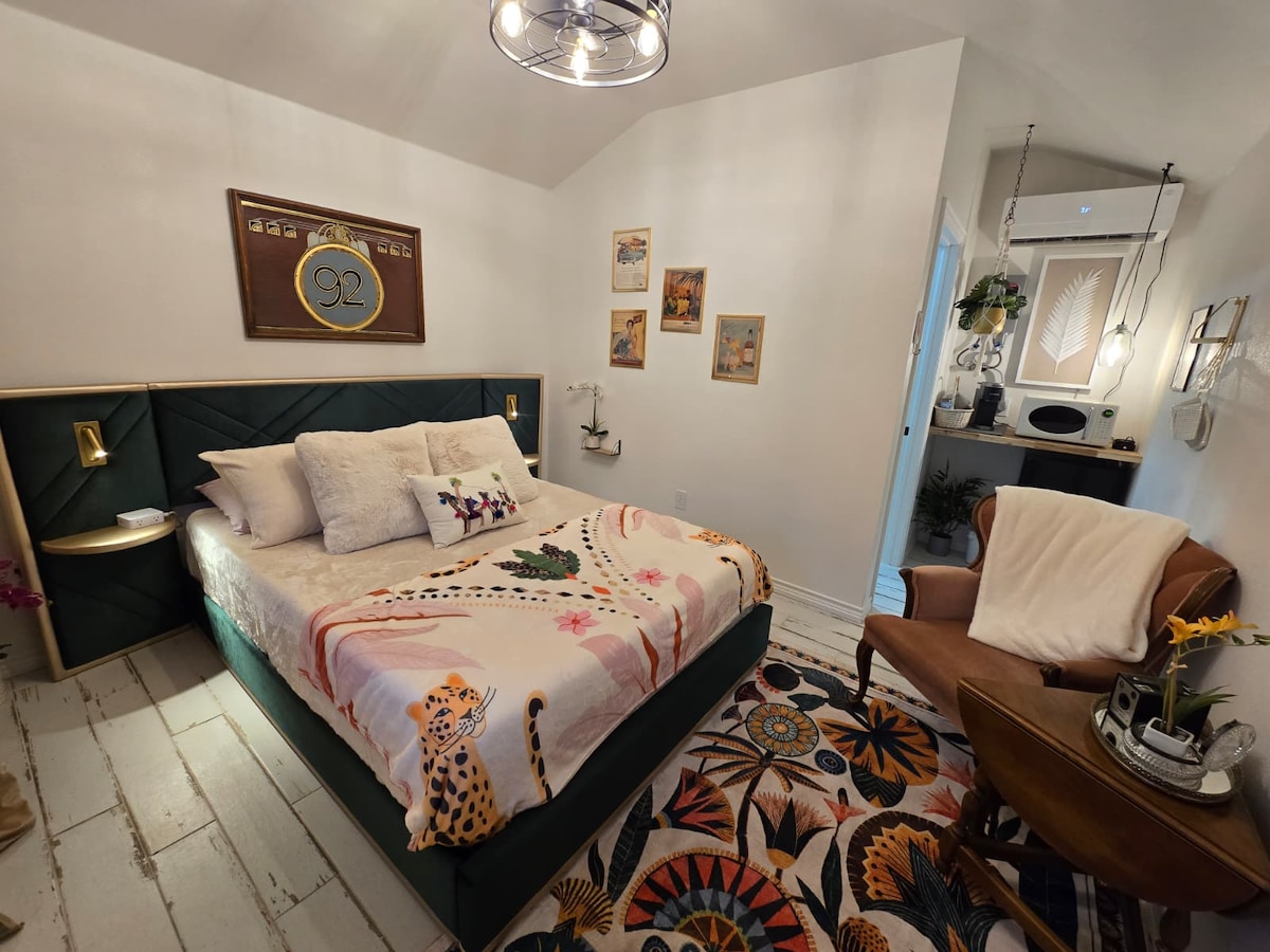 Disfruta de habitaciones cálidas y modernas con wifi, televisores inteligentes, minineveras y cafeteras Keurig. Cada suite tiene un baño privado en suite con ducha de azulejos y tocador personalizado. Duerme profundamente en lujosas camas tamaño king. Registro de entrada autónomo a través de la cerradura con teclado: el código de la puerta se envía después del pago y la firma del acuerdo digital (compatible con dispositivos móviles). Sin cargos obligatorios ocultos. Aparcamiento gratuito. Se aplican tarifas por mascotas. A pie de cafeterías, restaurantes y boutiques. Descubre el encanto de la histórica Ruta 66 en un edificio de 1905 bellamente restaurado