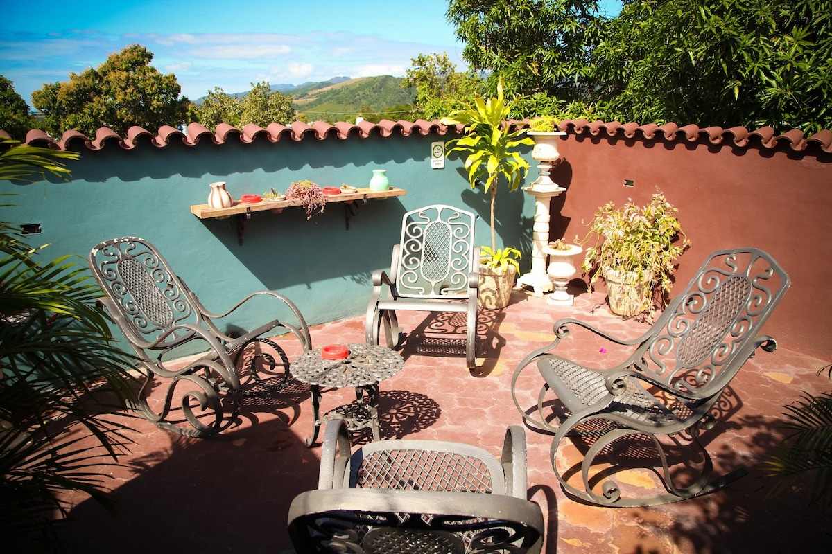 HOSTAL TERRAZAS BENJAMIN.Ubicado A pocos metros de área Histórica 5 Minutos de la Plaza Mayor.Mi casa cuenta con buena iluminación y ventilación,próxima a lugares de interés turístico como el camino a la piscina natural Hoyo del Pilón y la Plaza de las Tres Cruces.En Planta Alta con Habitación climatizada,agua fría caliente,minibar,baño independiente,terraza,done puede disfrutar,de un delicioso café cubano y exquisitos cócteles típicos del país.Se ofrecen Desayunos y Cenas. Coctel de Bienvenida.