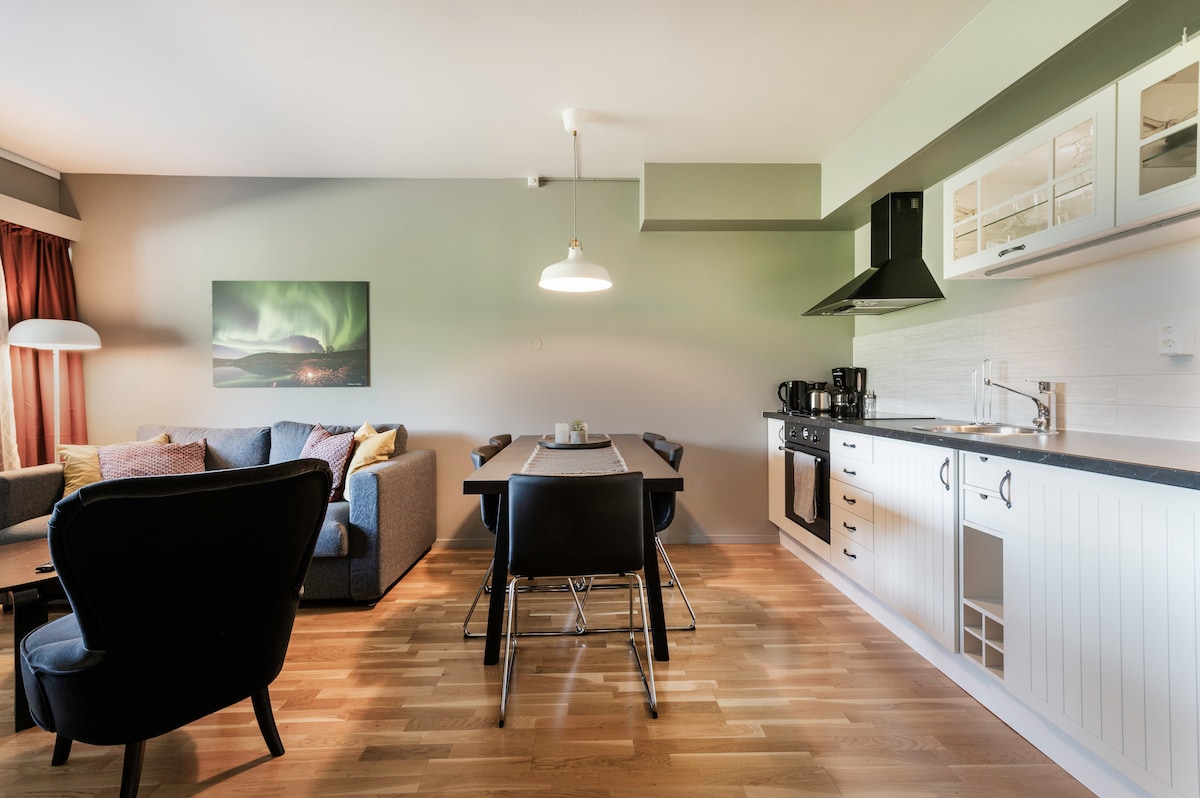 Apartamento moderno en el corazón de Trondheim con excelentes conexiones de autobús y una cafetería/panadería de primera categoría justo abajo.