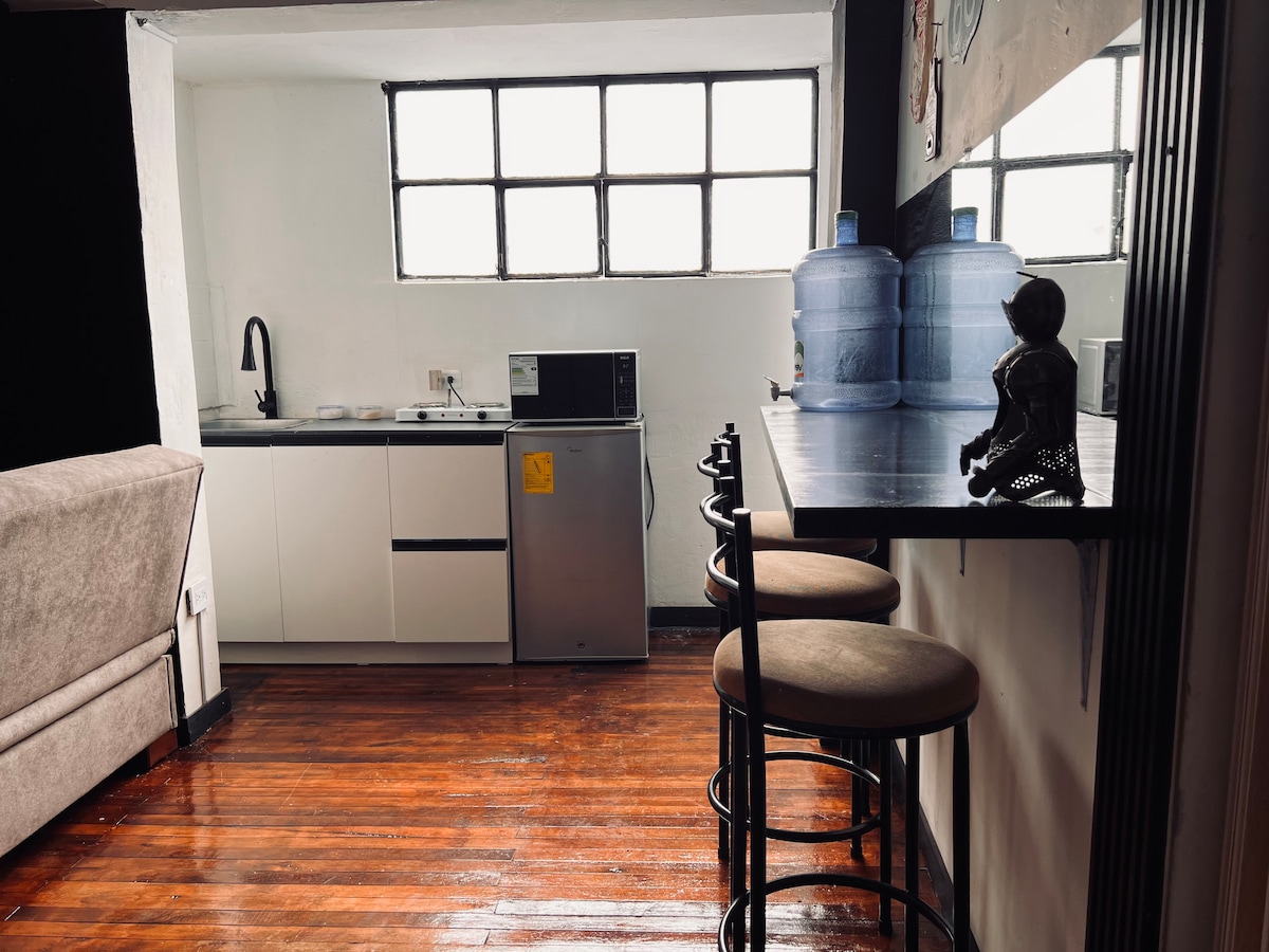 Acogedor departamento con excelente ubicación, cuenta con una pequeña sala, mesa de trabajo y cocina práctica, ideal para una estancia cómoda; . Está ubicado en el segundo piso con vista a la calle una zona muy conveniente. IMPORTANTE: al encontrarse en un entorno activo muy central y turístico, puede presentarse ruido por carros, buses o otros vehículos.