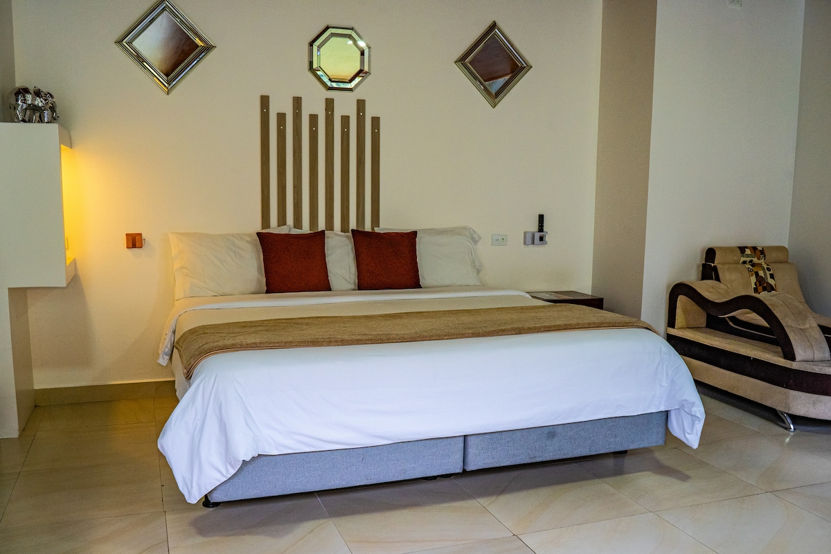 Suite Matrimonial King con Jacuzzi Privado Disfruta una estadía cómoda y especial en nuestra Suite Matrimonial King, ideal para parejas. Cuenta con una amplia cama King size y un jacuzzi privado perfecto para relajarse y desconectarse. El espacio es acogedor, elegante y ofrece total privacidad para una experiencia tranquila y placentera. Ideal para escapadas románticas, aniversarios o descanso de fin de semana.
