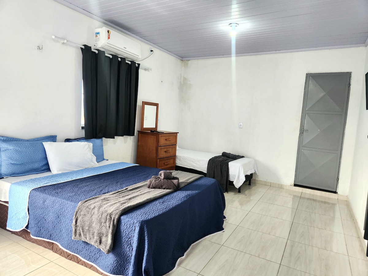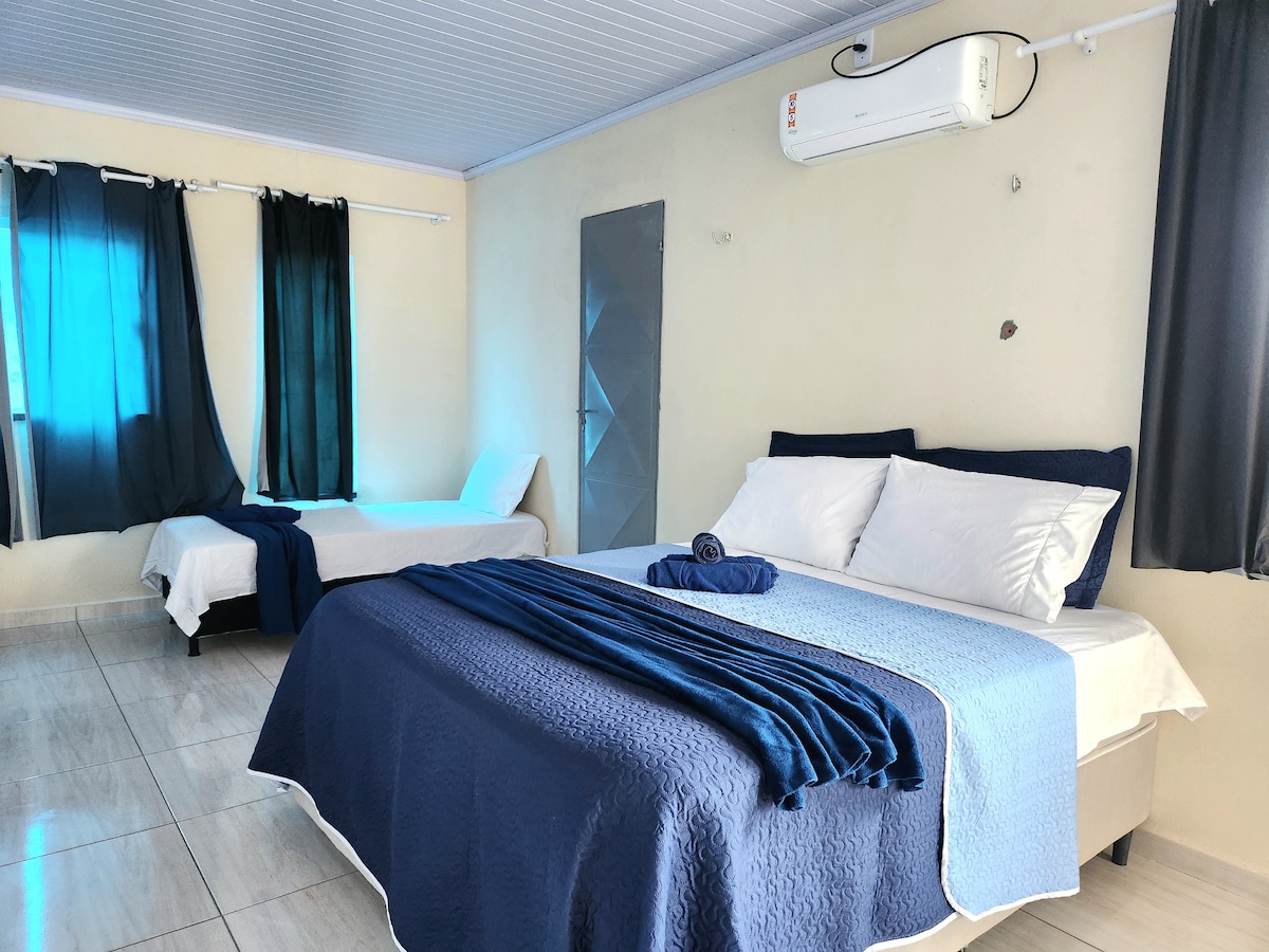 Quarto confortável e adaptado 01 cama box King casal + 01 cama articulada de solteiro Ar-condicionado Split para maior conforto TV LED 32" com parabólica Frigobar disponível (vazio) Secador de cabelo Banheiro privativo com ducha de aquecimento solar Quarto adaptado para pessoas com deficiência Ideal para quem busca praticidade, conforto e acessibilidade em sua estadia.