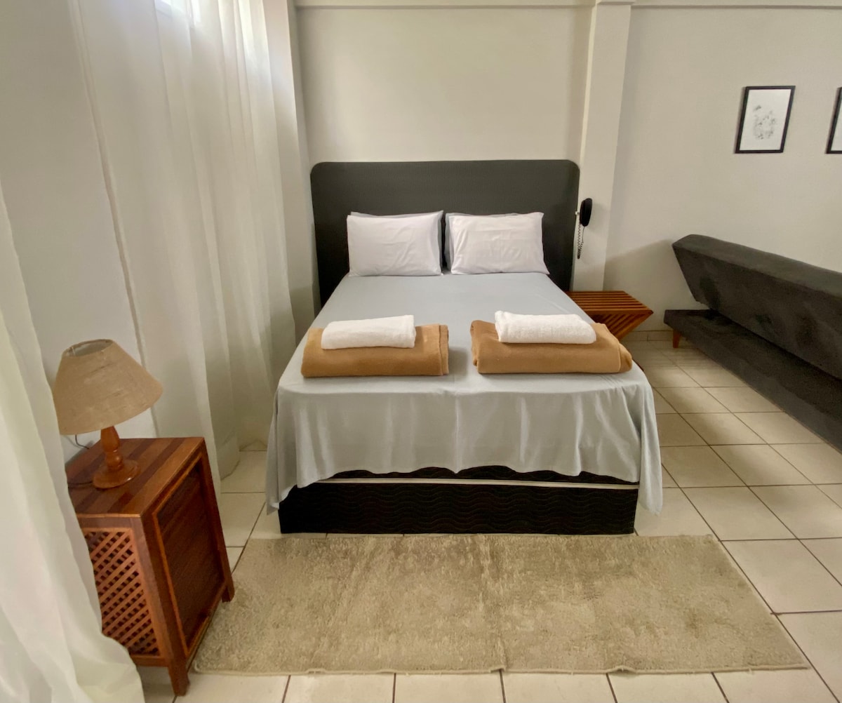 Acogedor estudio junto al Centro Comercial en Uberlândia, Minas Gerais. • Ubicación céntrica: a 500 metros de la Universidad de Uberlândia y Campo Santo Mônica, y a 200 metros del Ayuntamiento. • Caja de cama con colchón de hotel y ropa de cama de buena calidad. • Cocina con estufa eléctrica y frigobar. • Baño compacto con todos los servicios ❌No hay aparcamiento disponible.