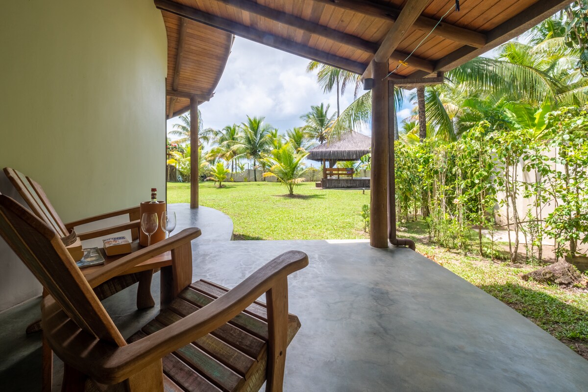 Con acceso directo a la playa y aire acondicionado, este bangalo es una versión sofisticada de una típica casa vernácula que se ve habitualmente en el campo del estado tropical de Bahía. Sus mejoras incluyen puertas anchas, suelos blancos y armarios empotrados. Desde la cama se puede ver la playa y el mar más allá. El jardín tropical abraza la casa y sustenta la vida silvestre de muchas especies de aves. La amplia playa virgen está a solo unos pasos, un lugar muy tranquilo.