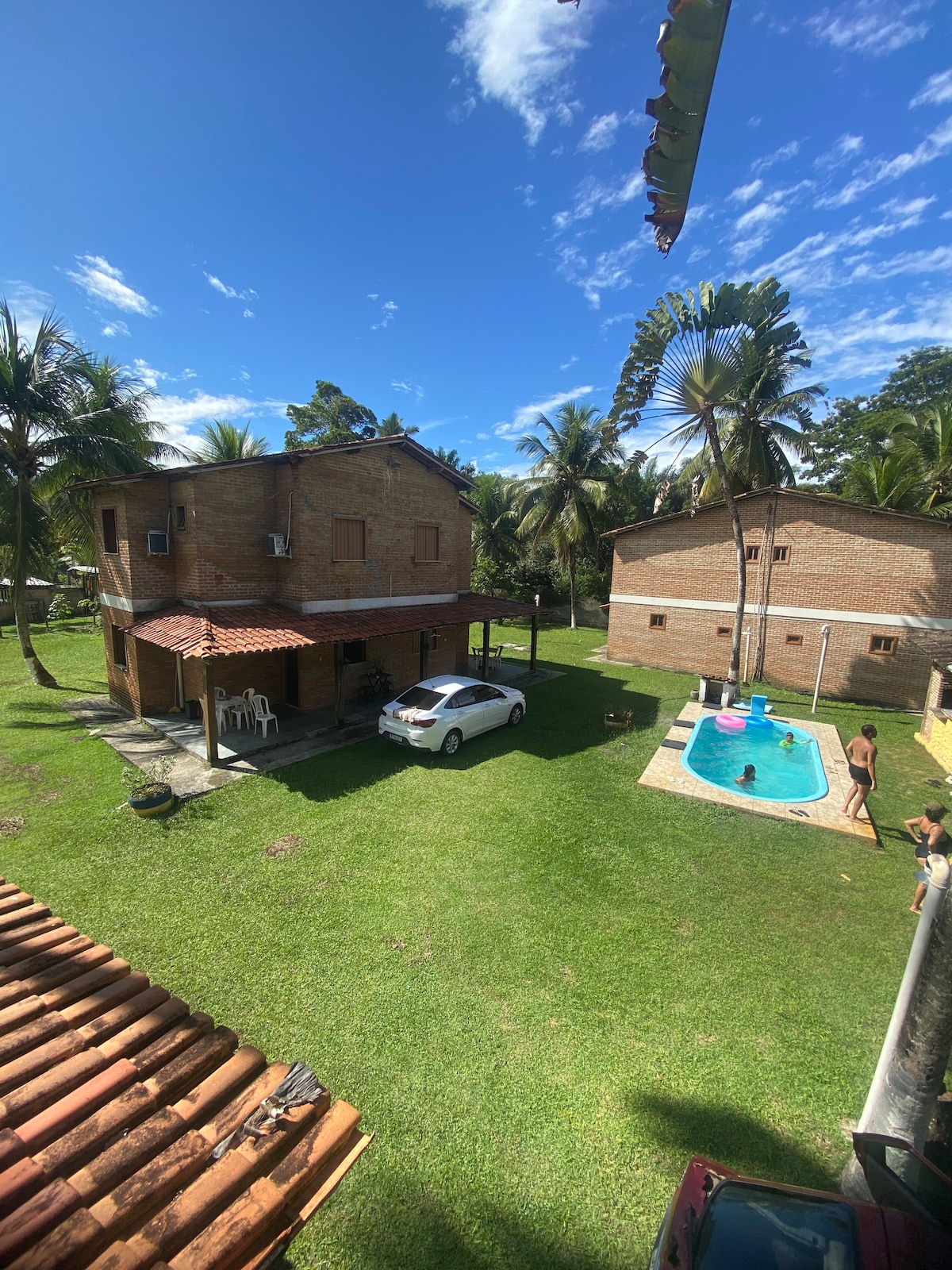 Hospedar en el centro de Serra Grande, cerca de todo, funcional y tranquilo, con una cocina exterior compartida y una gran zona verde.
