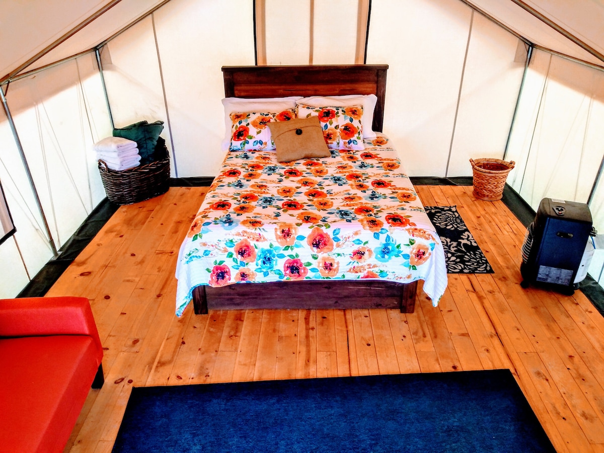 Nuestras tiendas glamping están ubicadas en nuestra granja boutique y vivero de 10 acres en un hermoso paisaje con vistas increíbles y cielos oscuros por la noche. Es una acampada acogedora en cualquier temporada e incluye una cómoda cama tamaño queen, con calentadores de colchón, calefacción suplementaria, luces, una sala de estar con sofá/futón, chimenea, mesa de picnic y ducha compartida y baño/espacio. Cerca de aguas termales, senderismo, ciclismo, paseos a caballo, senderos para todoterreno, parques estatales y nacionales. Se admiten mascotas cuando se incluyen en tu reserva.