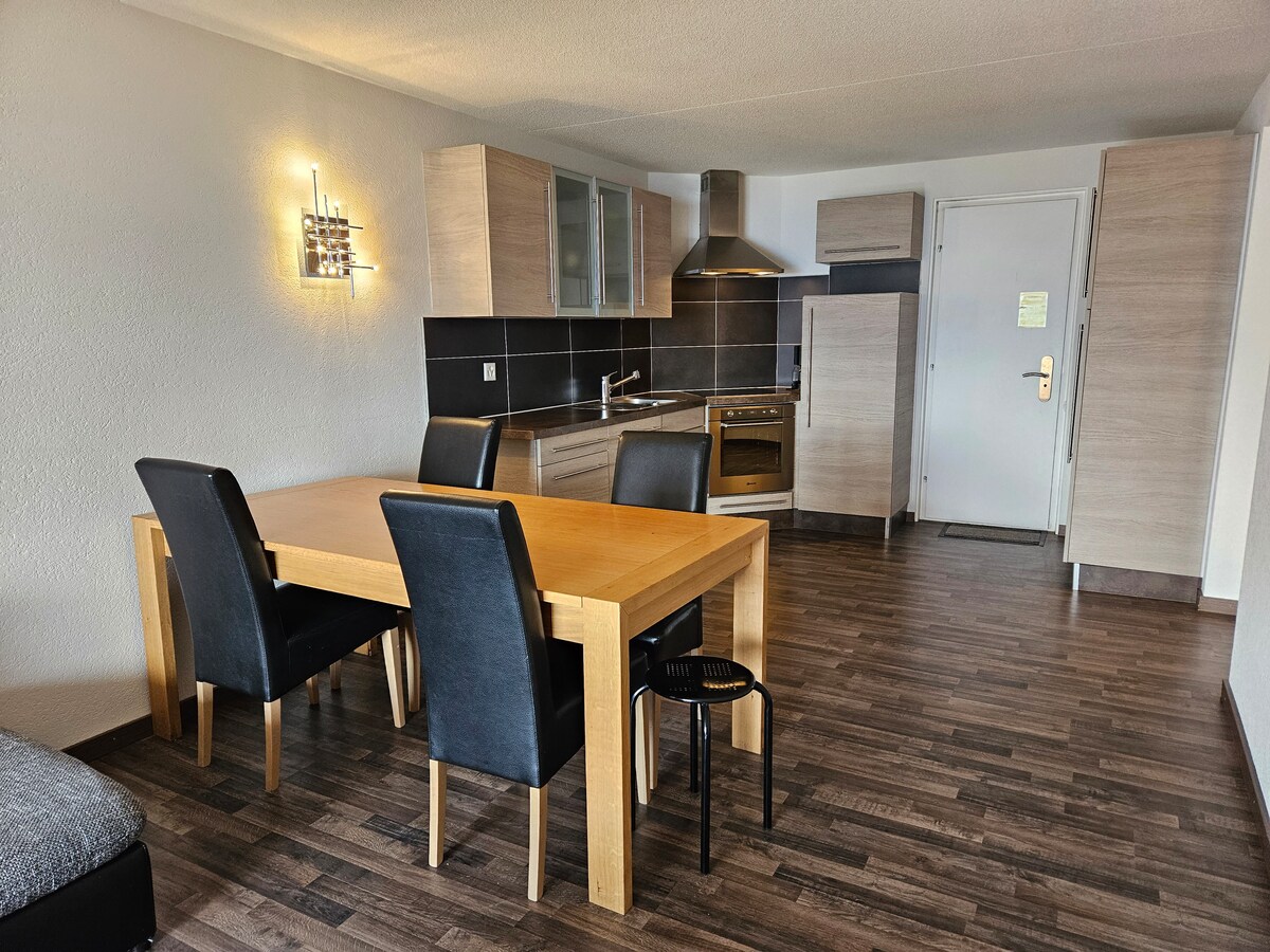 Apartamento con gran terraza sur y magníficas vistas a los Alpes del Valais. 1 dormitorio con una cama grande, 1 dormitorio con una cama de arriba, 1 baño con inodoro y bañera, 1 sala de estar con TV, cocina, comedor, 1 sofá cama para 2 personas.