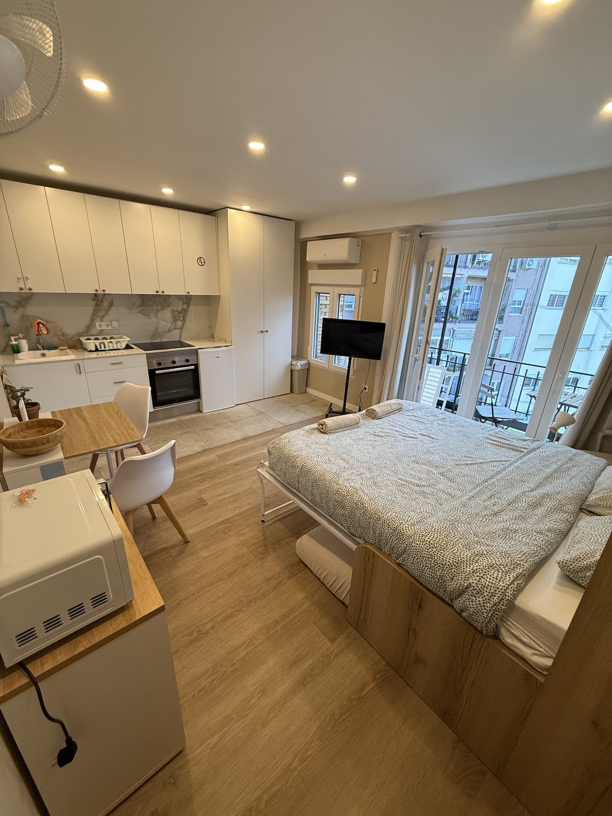 ¡Disfruta de Ruzafa desde nuestro acogedor estudio en la planta superior con baño privado y cocina! Ubicado en el último piso con acceso a ascensor, cuenta con aire acondicionado, TV inteligente e internet de alta velocidad. Disfruta de una cómoda cama/sofá plegable (135 x 190 cm), escritorio y mesa de comedor para un aprovechamiento eficiente del espacio. La cocina está equipada con horno y microondas, además de un gran armario para guardar cosas. Los extras incluyen agua filtrada, una mosquitera y una lavadora compartida. ¡Tu base perfecta en Valencia!