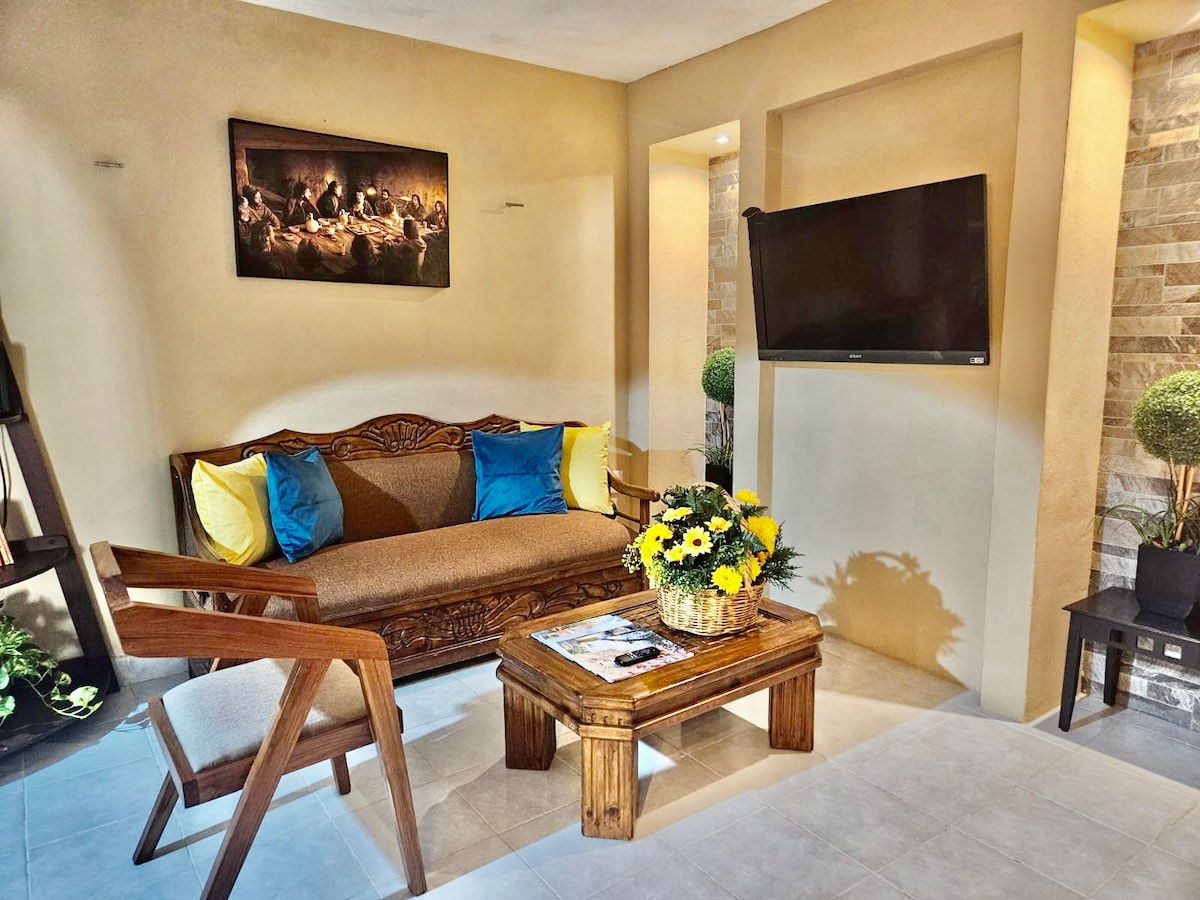 Un departamento totalmente nuevo, ubicado cerca del centro de la ciudad y a pocos metros de la famosa calle "La Calzada de los Frailes". El inmueble cuenta con un amplio patio trasero con mesas y sillas de jardín, rodeado de arboles que le dan vida al lugar. La primer área del departamento es la sala y la cocina integral; la segunda es la habitación, la cual tiene: -Cama Queen Size -Smart TV Netflix -Aire acondicionado -Closet para ropa con maletero -Baño completo -Mesa de trabajo y tocador