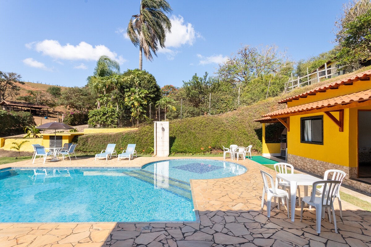 Hermosa casa de campo en Miguel Pereira con 4 suites y espacio integrado con cocina, barbacoa, televisión, sala de estar y ocio. Ambiente súper acogedor, rodeado de impresionantes paisajes. Perfecto para una reunión de familiares y amigos (hasta 18 adultos) que buscan un ambiente relajante y al mismo tiempo cerca del centro de la ciudad (3 minutos en coche o 10 a pie). Piscina, barbacoa, mesas de ping-pong, voleibol y fútbol. Wifi. Cocinero/ama de llaves opcional.