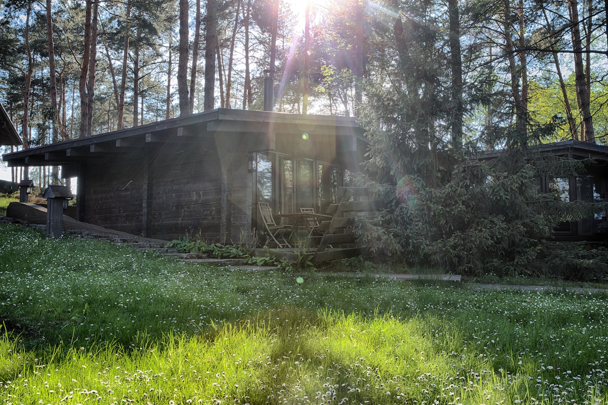 Cabaña de madera en un pinar