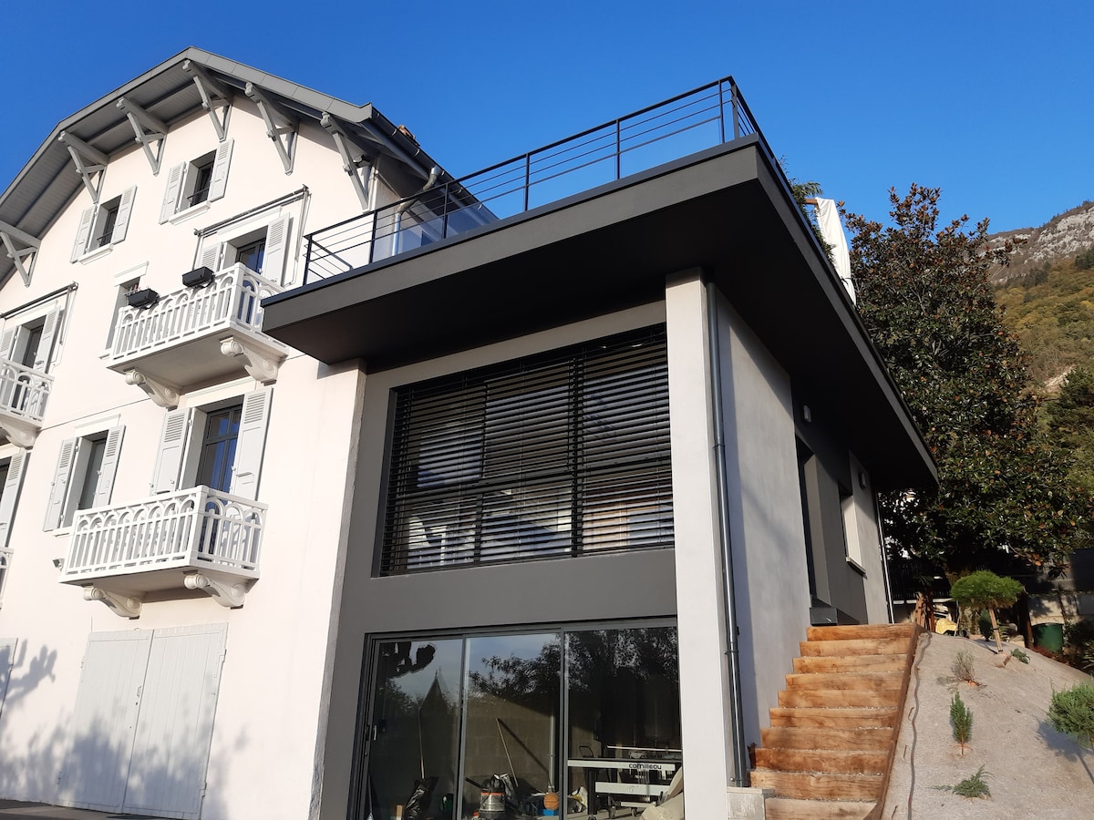Precioso apartamento de 2 habitaciones, recién reformado, a 5 minutos del lago / a 10 minutos del centro de Annecy en coche, para un máximo de 3 personas (2 + 1 niño), en una hermosa villa, con entrada independiente, amplia terraza con vistas a la montaña y al pequeño lago, aparcamiento gratuito y bicicletas disponibles de forma gratuita. Puede haber algo de tráfico por la mañana y al final del día en la pequeña calle que hay delante de la terraza. Encontrarás el mismo anuncio en la categoría de habitaciones privadas debido a la limitación del número de noches.
