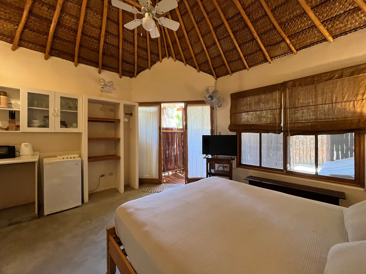 Exclusive cabin for two, designed for total harmony between the joy of a tropical garden, the privacy of a large property, and the proximity to the sea. Set on a hill with ocean views, in the quiet Guadalupe Condo, 7 min from the beach. Stunning 20m² bedroom with king bed, desk, Smart TV. Spacious bathroom with hot tub. Semi-open kitchen-living area. Starlink Wi-Fi, private parking, 24/7 security, and easy mototaxi access. Perfect for couples seeking for authenticity and nature.
