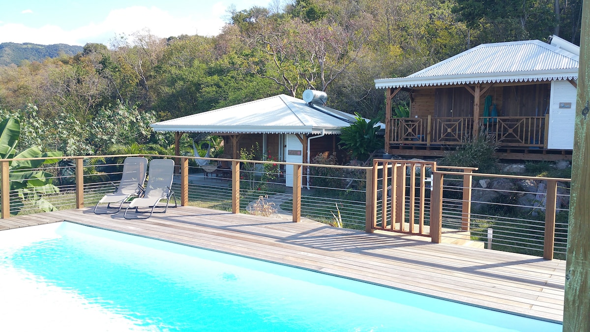 Tiny House encaramada en una colina a 400 metros de altitud en medio de un huerto frutal. accesible por un camino forestal en buen estado. Lugar tranquilo y aislado entre el mar y la montaña con una vista dominante. Alojamiento naturalmente fresco y ventilado sin mosquitos. Alojamiento ecológico. Situado a 10 minutos de la playa de Leroux a 20 minutos de la playa de Malendure a 20 minutos de la playa de Grande Anse Adecuado para personas que deseen desconectar, descansar o reponer energías.