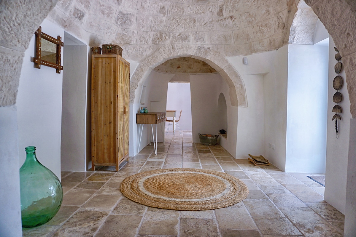 Este espacio único, tallado dentro de los trullos tradicionales, tiene su propio encanto y te permite experimentar el verdadero espíritu del valle de Itria. Se entra a través de una antigua pérgola de fresas y uvas. La cocina y el baño están ubicados en las alcobas, mientras que las zonas de comedor y dormitorio están ubicadas en un trullo sarraceno y un trullo de cono alto. El patio privado y la piscina infinita cercana ofrecen vistas al valle y al horizonte de Ceglie Messapica.