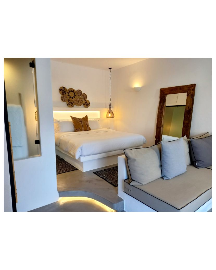 Con diseño cicládico y enfoque bohemio, con colores cálidos y muebles de madera hechos a mano, disfruta de una suite lujosa pero elegante para tus vacaciones. Nada en la piscina infinita ecológica con agua de mar mientras contemplas las impresionantes vistas al mar y disfrutas del sol tumbado en una tumbona junto a la piscina. También hay una playa privada debajo del asentamiento de las suites Aloe Mare. Bebe tu cóctel en la pequeña segunda piscina frente a la suite. ¡Estamos deseando darte la bienvenida!
