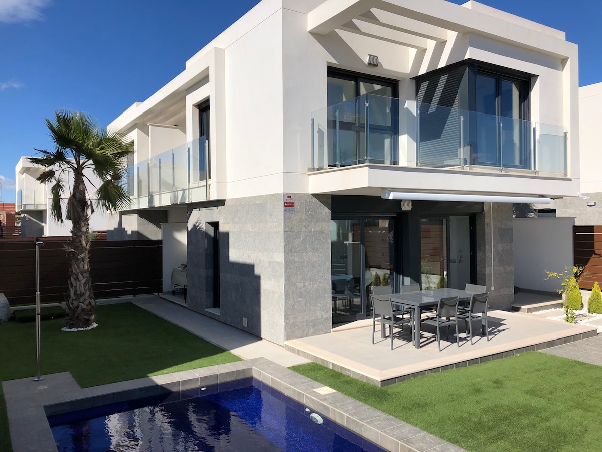 Maison neuve hyper moderne avec piscine privée de 8 m en bordure d'un golf à 15 minutes des belles plages de Torrevieja. Elle est composée d'une belle terrasse, d'un beau petit jardin exposé sud avec barbecue. Elle possède 3 chambres modulables en grand lits ou lits simples dont l'une au rez de chaussée avec salles de bain. la cuisine est hyper équipée avec four, micro-onde, un grand frigo, lave-vaisselle et machine à laver.