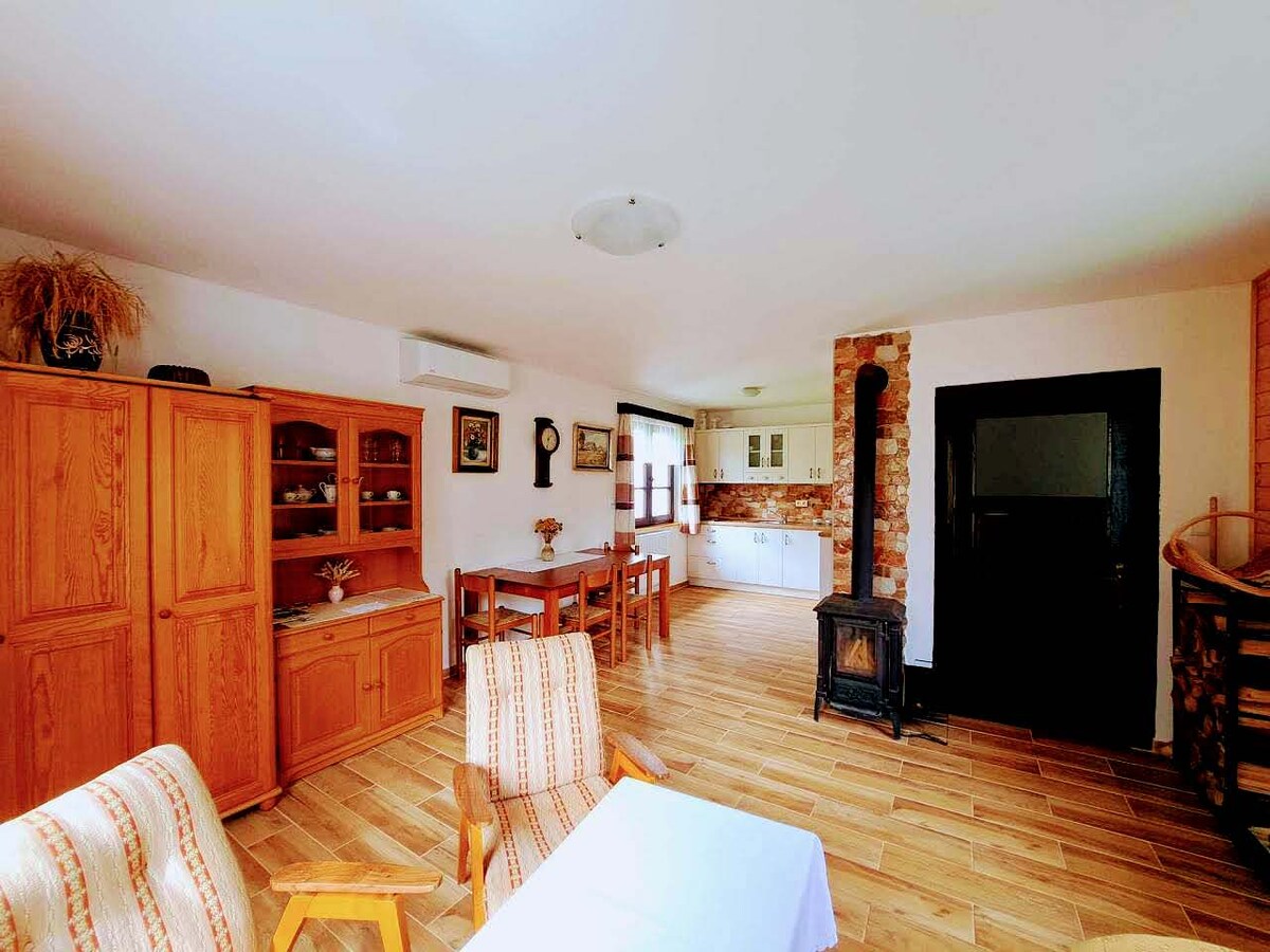 Le ofrecemos una cabaña única original del siglo XVIII con estufa de azulejos funcional, totalmente renovada y equipada, ideal para relajarse y alejarse del ajetreo y el bullicio de la vida moderna. También hay una zona de estar al aire libre con parrilla y sombrilla, equipamiento deportivo para hacer ejercicio, yoga, bádminton, fútbol y frisbee. La casa se encuentra en un pintoresco pueblo de la región de Moravia del Sur, famosa por su vino, naturaleza y monumentos históricos. Durante esta estancia única y tranquila podrá relajarse perfectamente.