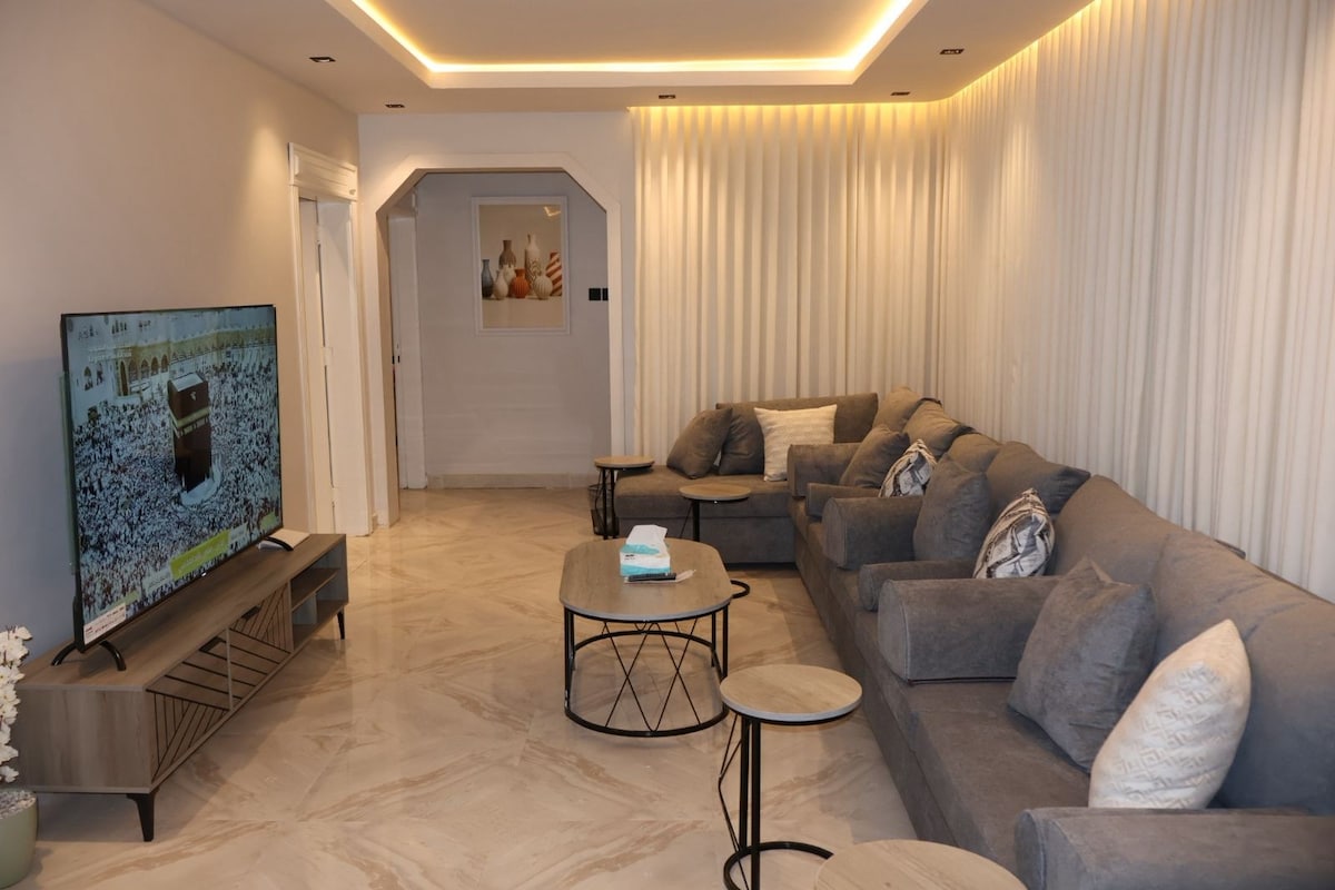 استرخ في هذا المسكن الهادئ والأنيق. بشاشة عرض 70 بوصه ومطبخ مجهز وادوات فندقيه متكامله في شارع مكتمل الخدمات .