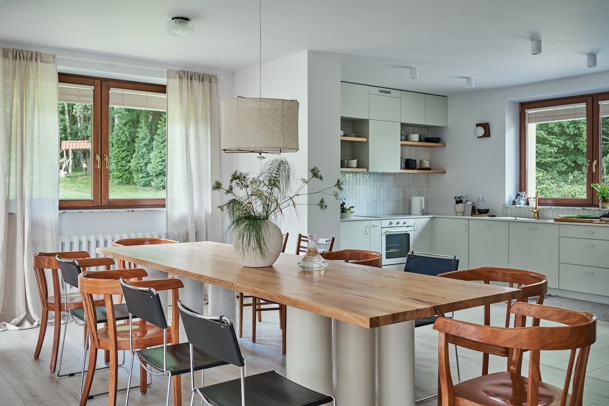 Amplia y acogedora casa con cinco dormitorios separados ubicados en las afueras rurales de Cracovia. Gran salón comedor con cocina totalmente equipada, una gran mesa para 10, dos baños modernos y una gran terraza que conduce al jardín a disposición del huésped. Las habitaciones están equipadas con cómodas camas dobles o individuales y grandes armarios. En el salón también hay una televisión de pantalla plana y una chimenea que hará que las noches que pases en el sofá sean una experiencia verdaderamente relajante.