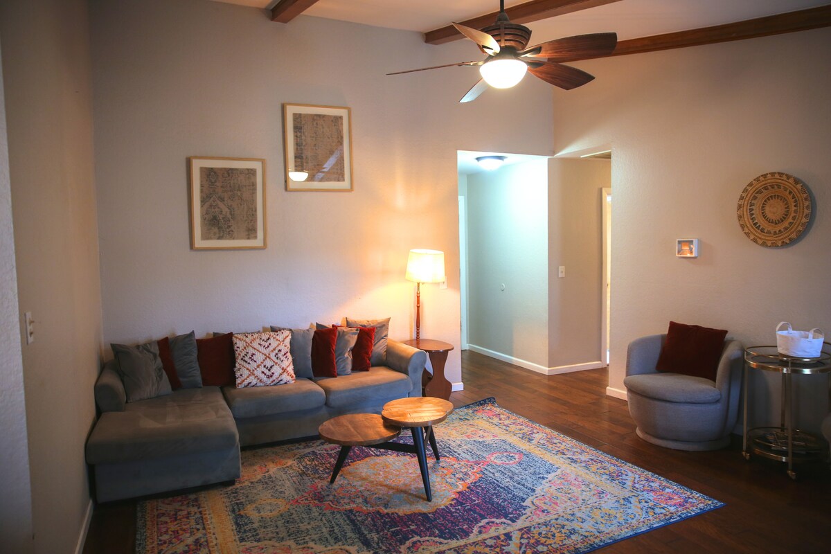 Relájate con toda la familia en este elegante y tranquilo refugio, perfectamente ubicado a solo 7 millas del centro comercial Woodland Hills y de restaurantes de primera categoría, y a solo 20 minutos del aeropuerto internacional de Tulsa y del centro de Tulsa. Esta casa bellamente decorada ofrece 3 dormitorios, 2 baños completos y televisores en cada dormitorio para mayor comodidad y conveniencia.