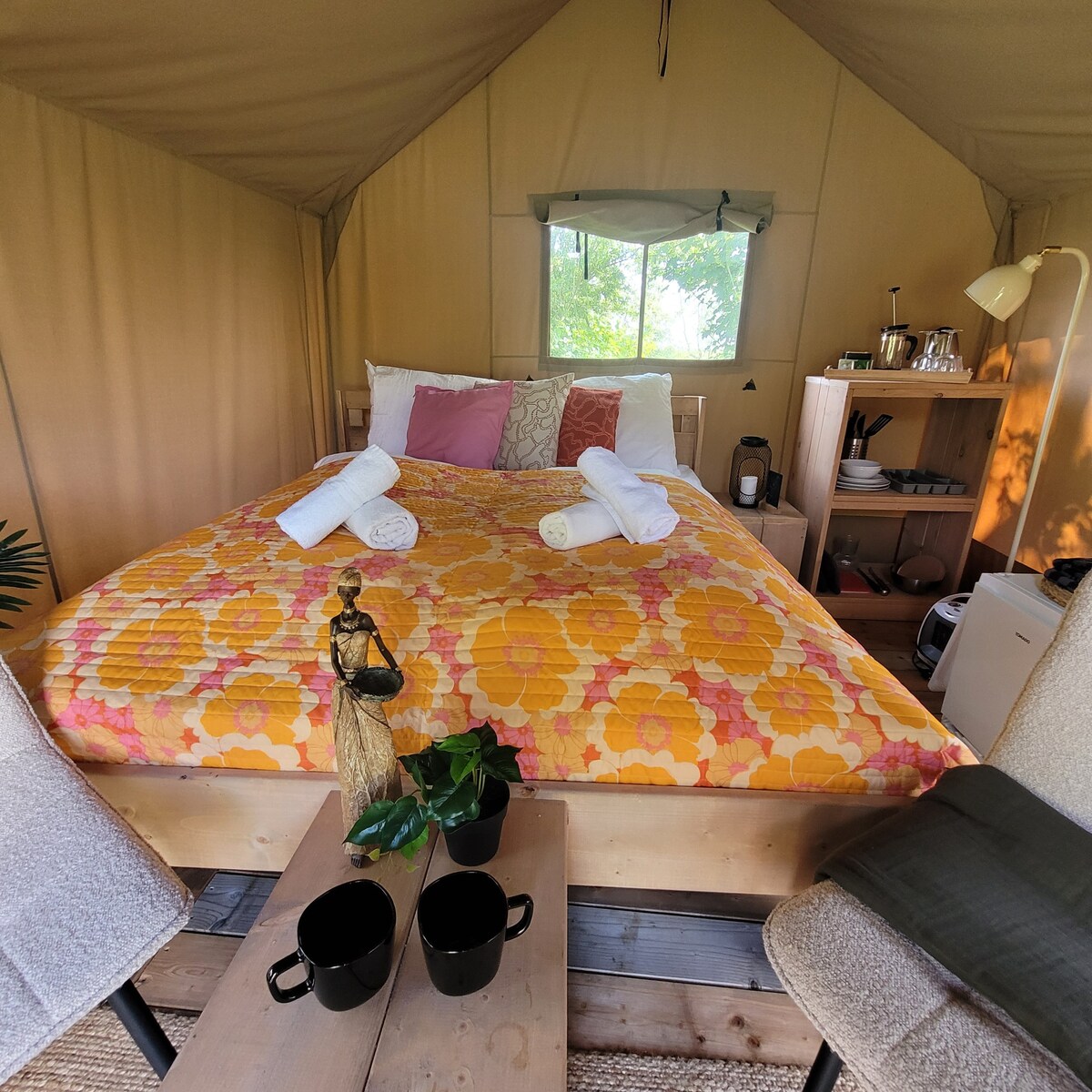 ¡Disfruta de la comodidad de una habitación de hotel, pero luego en medio de la vegetación! Equipado con nevera, utensilios de comedor y bebida, calentador eléctrico, manta eléctrica, terraza con conjunto de salón, barbacoa de trípode y una gran cama doble de madera con colchones finos y ropa de cama de hotel. ¡La nueva y espaciosa cocina al aire libre con cuatro barbacoas de gas y 4 quemadores está a tu disposición! ¡Duchas e inodoros amplios y limpios! ¡La bañera de hidromasaje de leña se puede reservar como un paquete privado, con un costo adicional!
