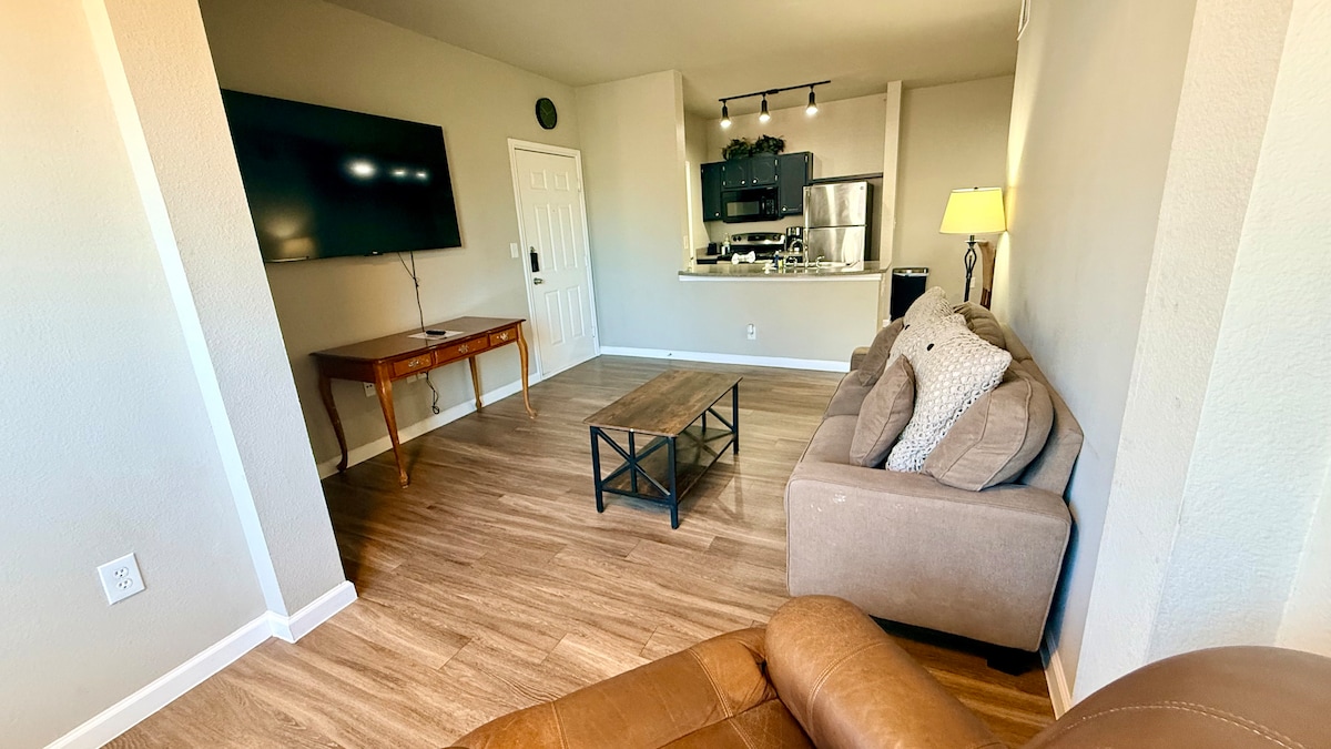 Amplio apartamento de 2 dormitorios, 2 baños, 1 oficina/sala de entretenimiento con comodidad y seguridad en mente. Incluye: - Hoguera. - barbacoa al aire libre -cornhole -xbox - patinete eléctrico - Estación de café. - Cámaras exteriores. -Lavadora y secadora - Juegos aptos para familias. - Amplio aparcamiento con videovigilancia en la parte delantera y trasera. Convenientemente ubicado cerca de la I-35, haciendo que los viajes al Dominio, al centro y al aeropuerto sean de fácil acceso. También tiene un sendero para caminatas y bicicletas que conduce a un parque infantil público, así como a un parque.